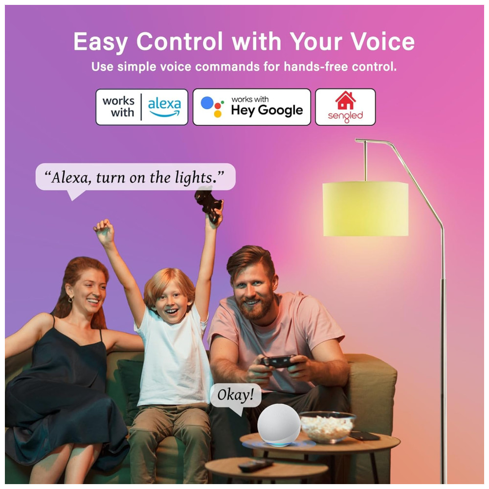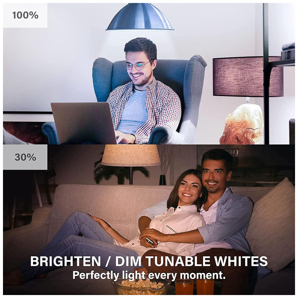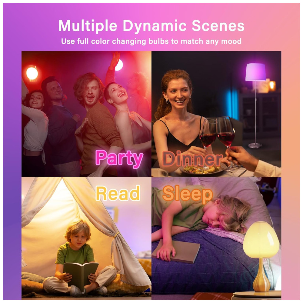 Controle de voz lâmpadas inteligentes WiFi Classic que mudam de cor que funcionam com Alexa e Google Home. Controle sua lâmpada inteligente por meio de comandos de voz para ligar, desligar suas lâmpadas inteligentes, criar cenas de humor coloridas, ajustar o brilho e muito mais, por exemplo, ligue as lâmpadas Alexa antes de sair da cama, diminua as luzes inteligentes do sofá para assistir a um filme.