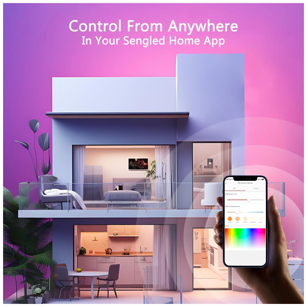 Recurso de programação Projetado com 16 milhões de cores e branco ajustável âmbar a branco frio, de 2000K a 6500K com HIGH CRI90. Configure facilmente usando o aplicativo Sengled Home iOS e Android, ligue , desligue a lâmpada inteligente, diminua a lâmpada inteligente para o nível desejado e configure horários de qualquer lugar. Programe temporizadores e rotinas para automatizar toda a configuração de iluminação doméstica inteligente. Controle suas lâmpadas inteligentes enquanto estiver fora de casa.
