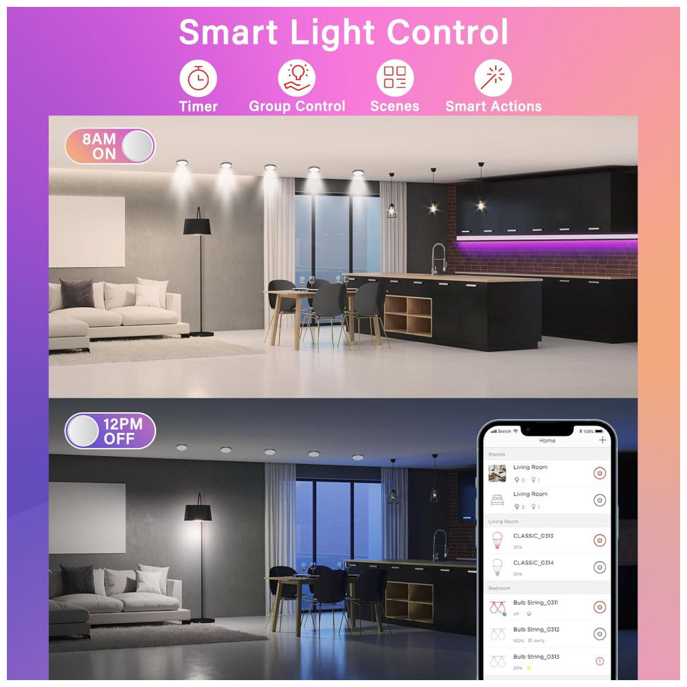 Controle remoto melhore sua casa inteligente com luzes inteligentes que mudam de cor de lâmpada WiFi, controladas remotamente onde quer que você esteja. Defina temporizadores e horários de luz, automatizando suas luzes inteligentes para fazer parecer que alguém está em casa, mesmo quando você estiver ausente. Você também pode criar um grupo para todas as suas lâmpadas alexa e agrupar facilmente o controle de suas lâmpadas inteligentes com dispositivos Alexa ou players do Google Assistant.