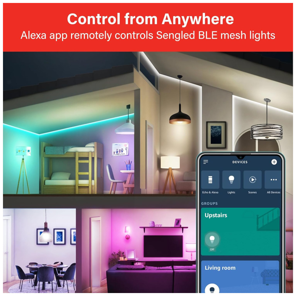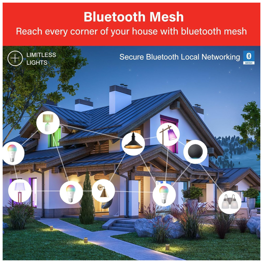 Iluminação inteligente para toda a casa A tecnologia sem fio Bluetooth Low Energy BLE Mesh 5.0 permite um alcance maior, permitindo instalações em toda a casa. Cada lâmpada inteligente multicolor A19 serve como repetidor de sinal, de modo que, mesmo que uma lâmpada Bluetooth esteja fora do alcance do dispositivo Alexa Echo, ela ainda pode ser controlada usando a rede Mesh