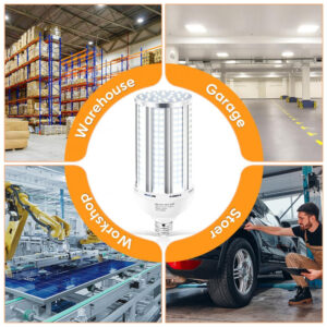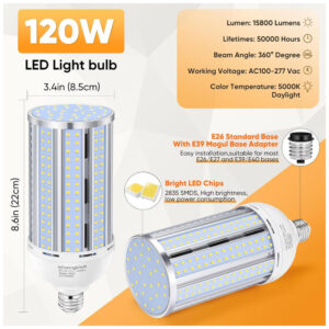 O conjunto de 3 lâmpadas LED Corn de 120W, equivalentes a 1200W, com base E26/E39, temperatura de cor 5000K daylight e 15.800 lumens, é ideal para iluminação interna e externa em garagens, galpões, fábricas, oficinas, ruas e quintais. Estas lâmpadas possuem tecnologia fanless, garantindo funcionamento silencioso e maior durabilidade. Com ângulo de abertura de 360°, oferecem iluminação uniforme e eficiente, substituindo lâmpadas tradicionais como vapor metálico e fluorescentes. São fáceis de instalar em soquetes padrão, economizam energia e proporcionam luz branca natural ideal para ambientes de trabalho e segurança. O peso de envio fica por volta de 1,6 kg para o kit com 3 unidades, com embalagem adequada para transporte seguro.