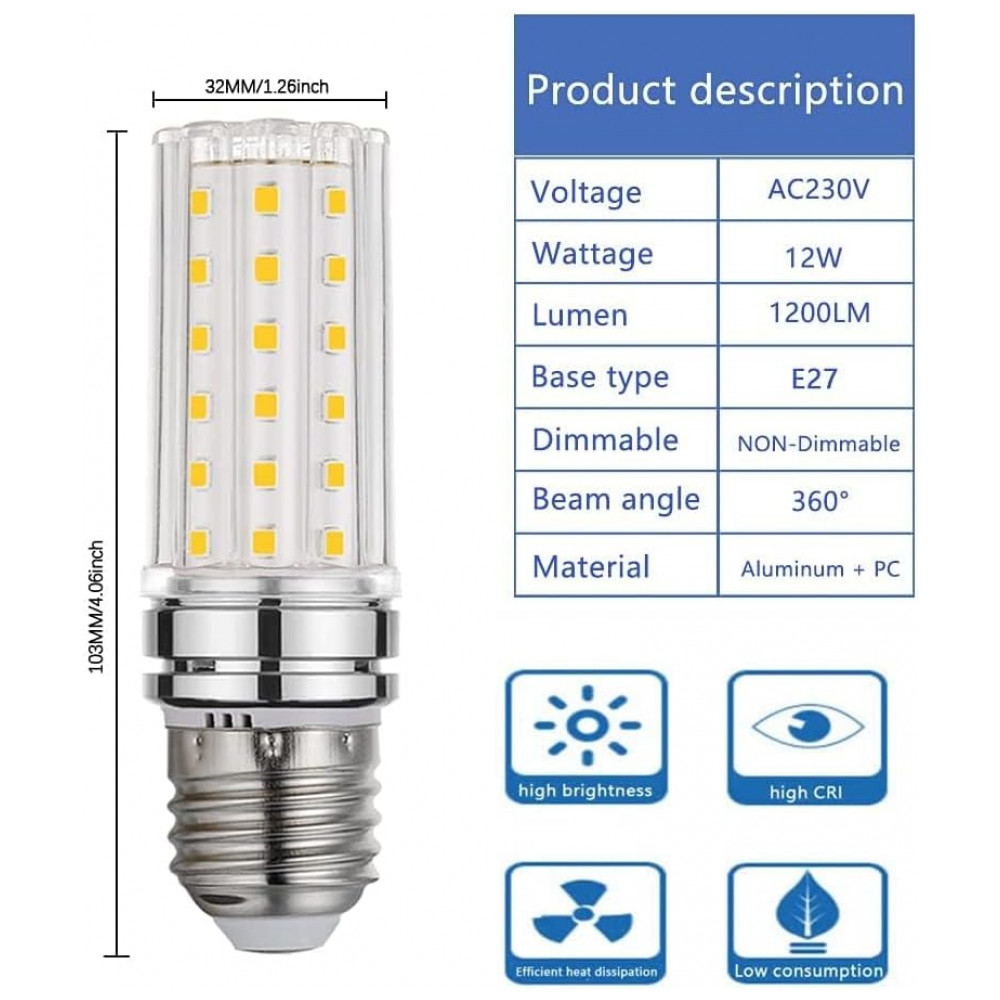 A lâmpada LED de milho de alta qualidade oferece 12W de potência, vida útil longa.Com a capacidade de economizar 85% na conta de energia, essas lâmpadas LED são um substituto ideal para lâmpadas incandescentes. Com um ângulo de feixe de 360 graus e índice de reprodução de cor de 85, proporcionam luz vívida e natural em ambientes internos. Fácil de instalar, durável e com dissipação de calor eficiente, ideal para cozinhas, salas de estar, quartos e banheiros.