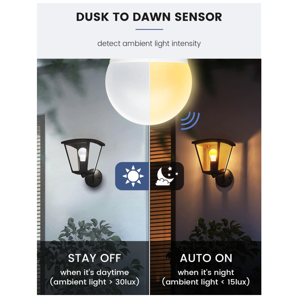 Anoitecer ao amanhecer Mãos livres, detector de fotocélulas embutido, essas lâmpadas do crepúsculo até o amanhecer acendem automaticamente quando o sol se põe menos de 15 Lux e desligam quando o sol nasce mais de 30 Lux. Adequado para uso interno ou externo.