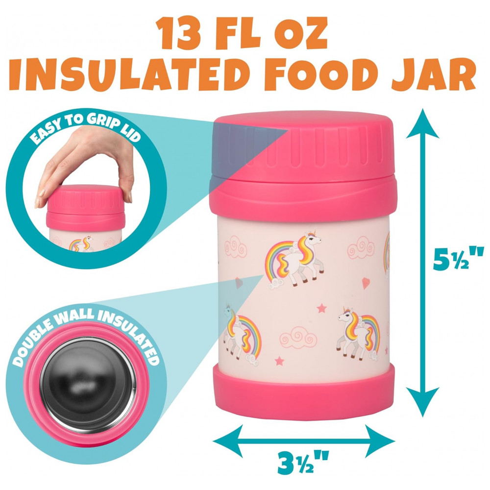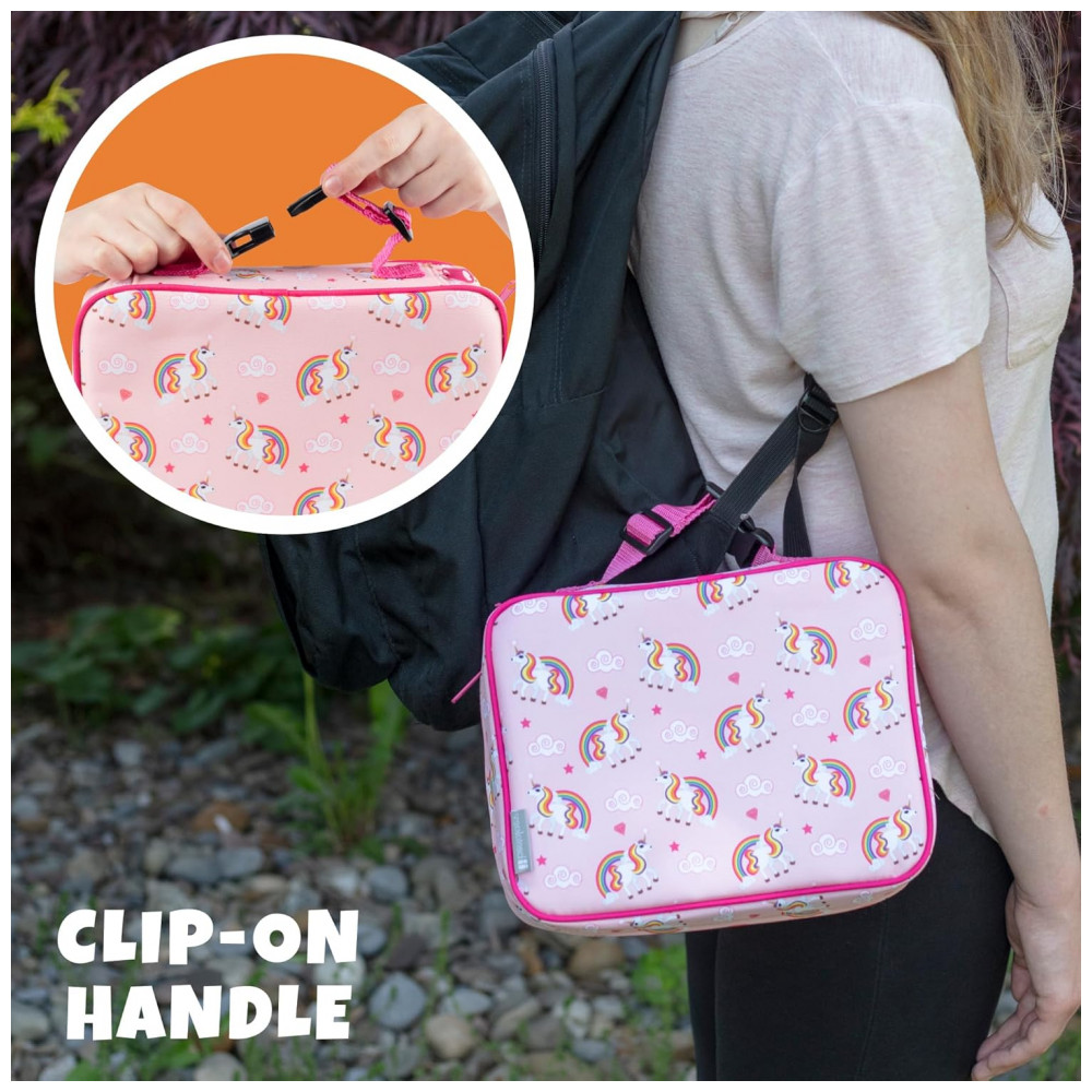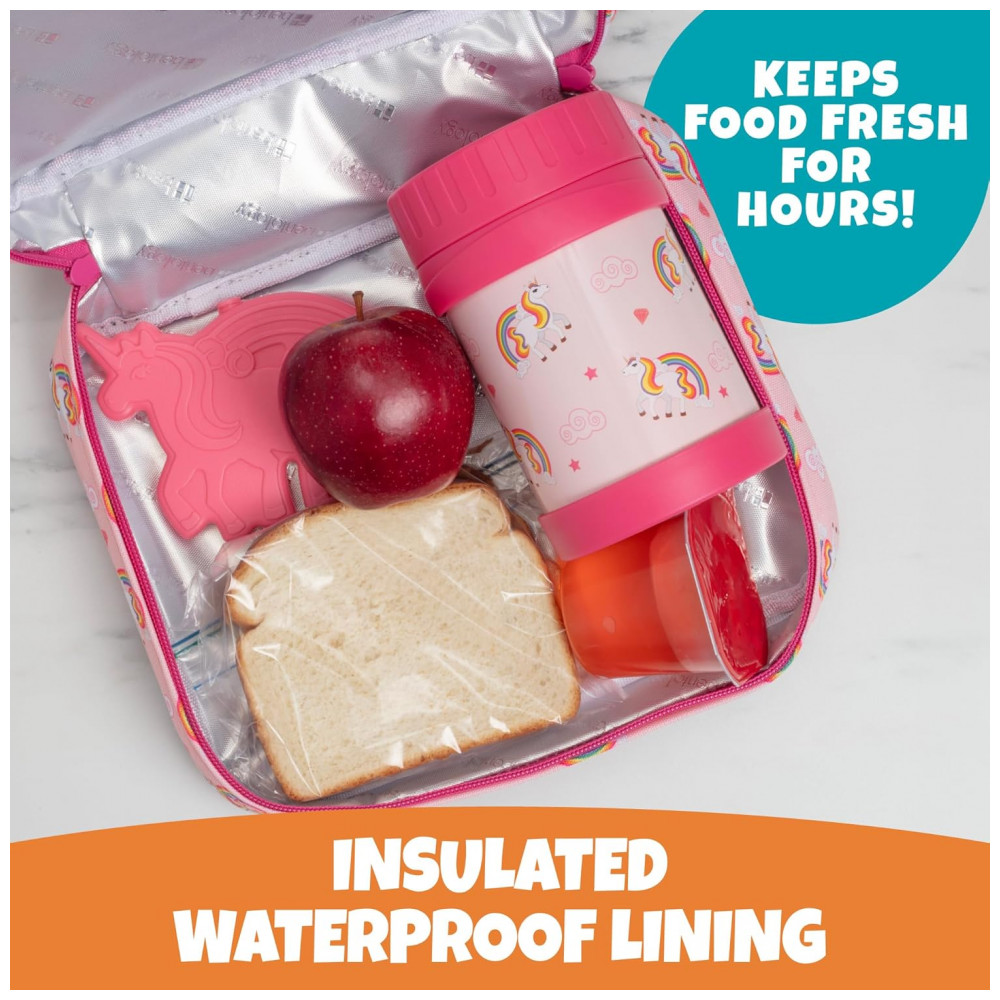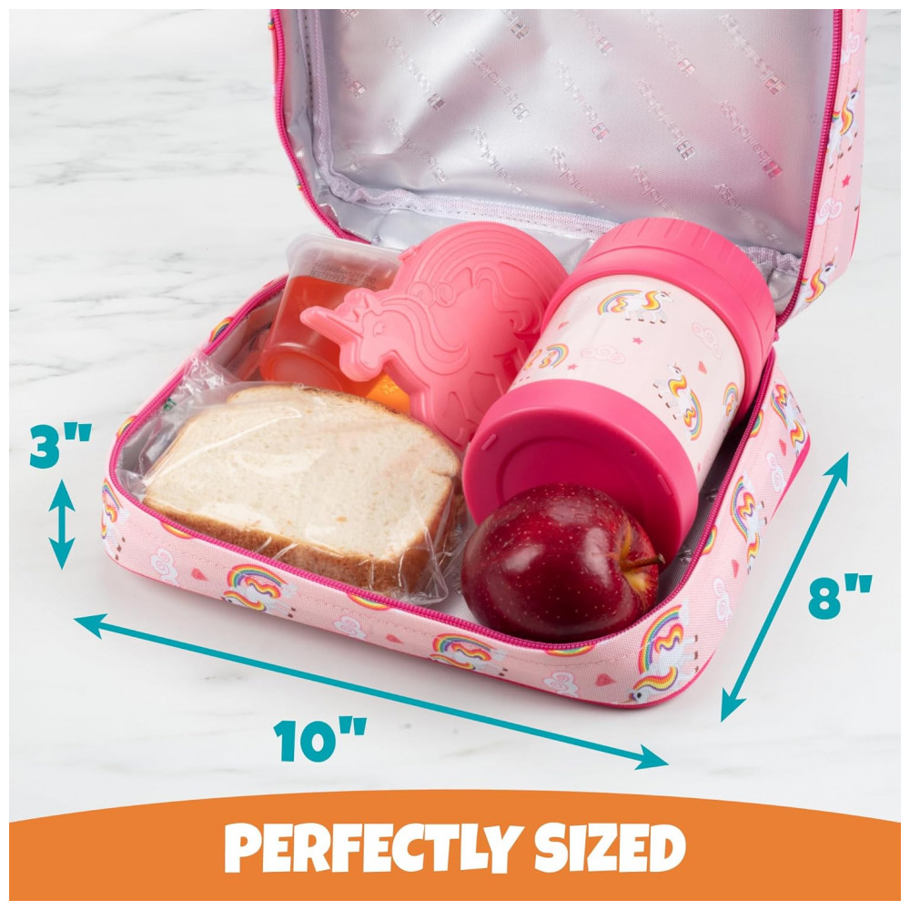 Tudo o que as meninas precisam para o almoço e o lanche divertido Inclui 1 luva de lancheira com estampa de unicórnio isolada, 1 pote de comida com isolamento e 1 pacote de gelo de unicórnio correspondente.