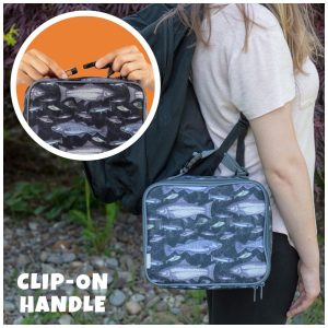 Possui uma alça de fivela lateral para transportar sua lancheira ou prendê la facilmente na parte externa de mochilas, bolsas ou pastas.