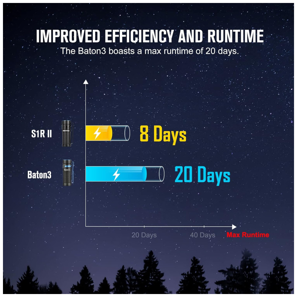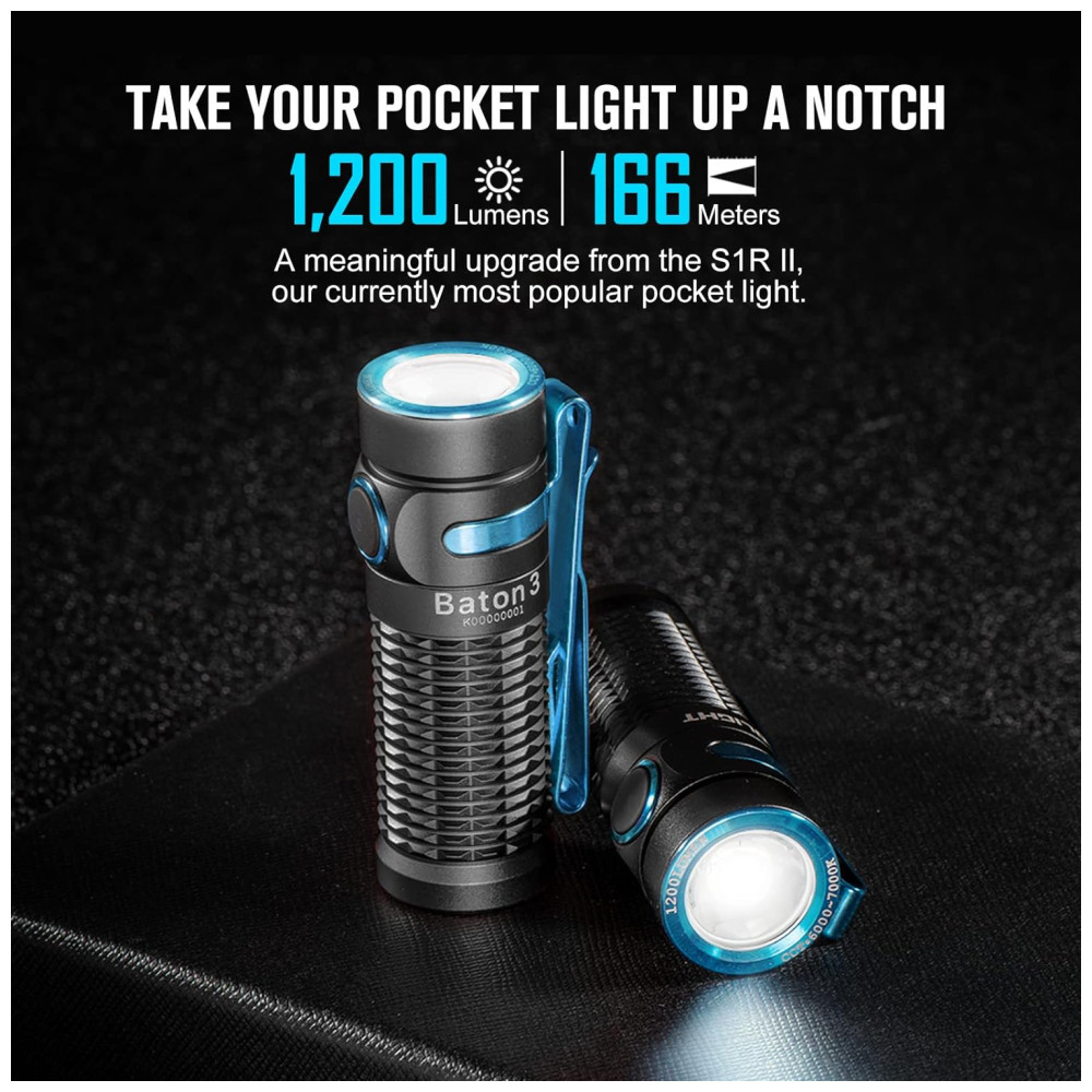 O Baton3 oferece uma enorme saída de 1200 lumens, um aumento de brilho de 20 e até 166 metros de alcance, um aumento de 14 em relação ao S1R II.