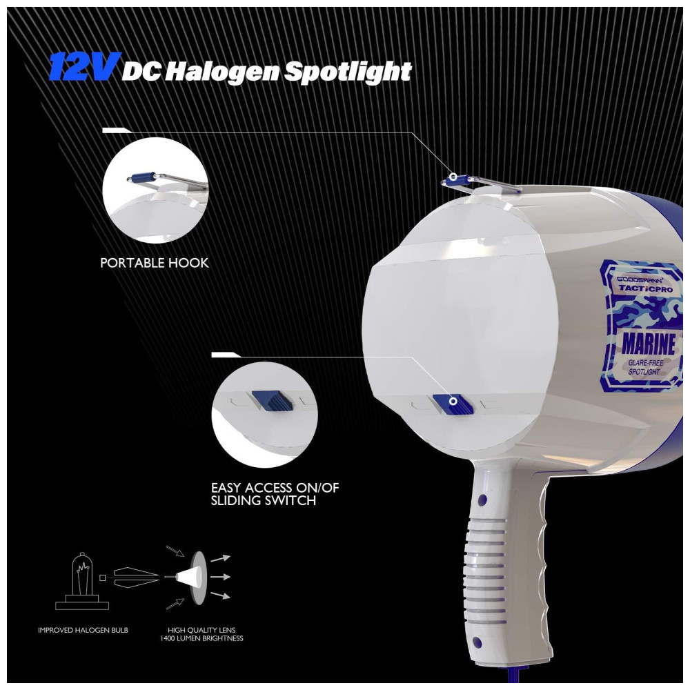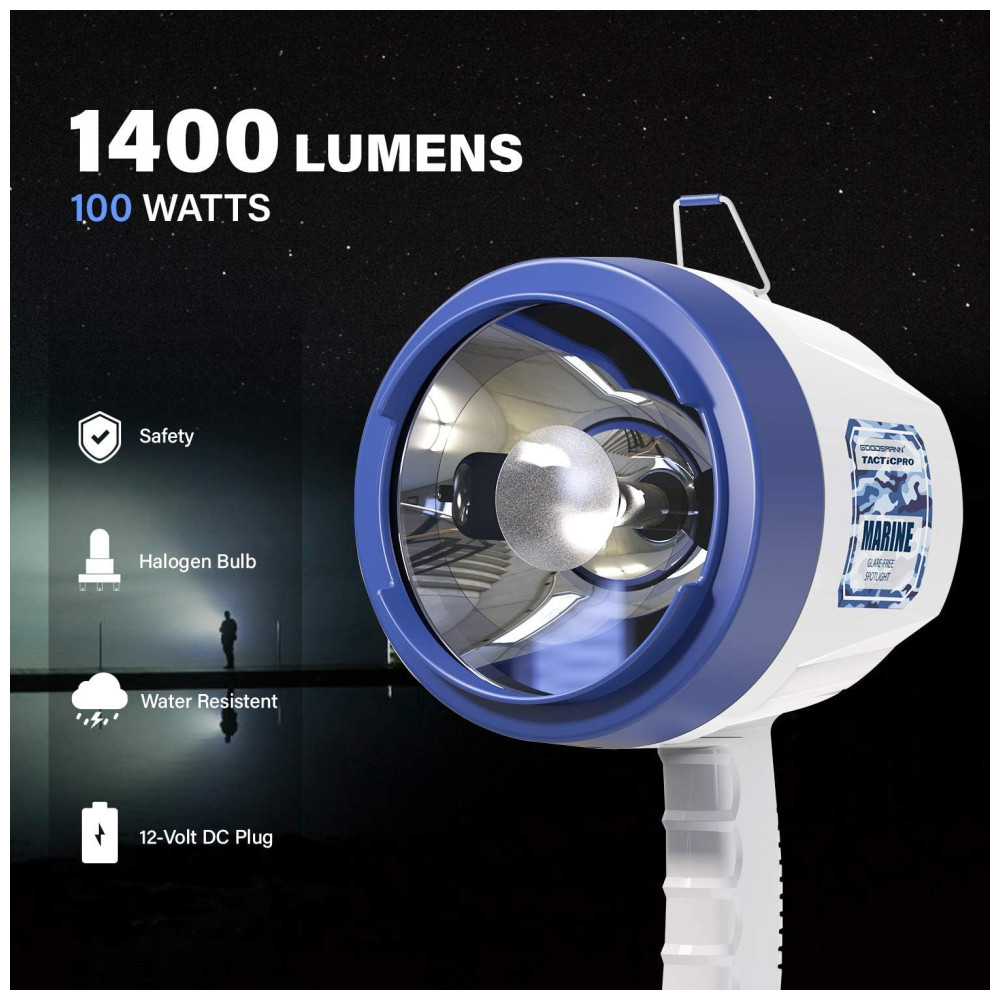 12V DC HALOGEN SPOTLIGHT Fornece 1400 Lumens com 530M de distância do feixe, para feixe mais amplo e brilho máximo