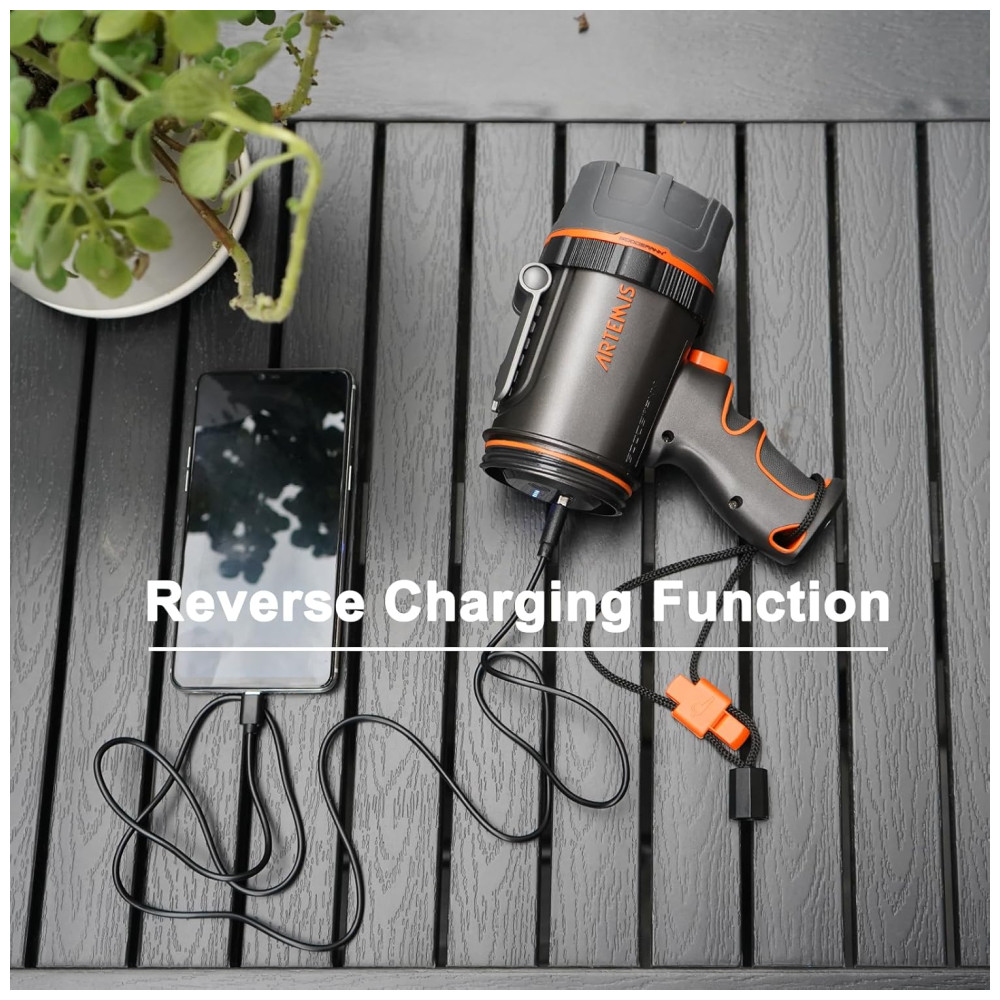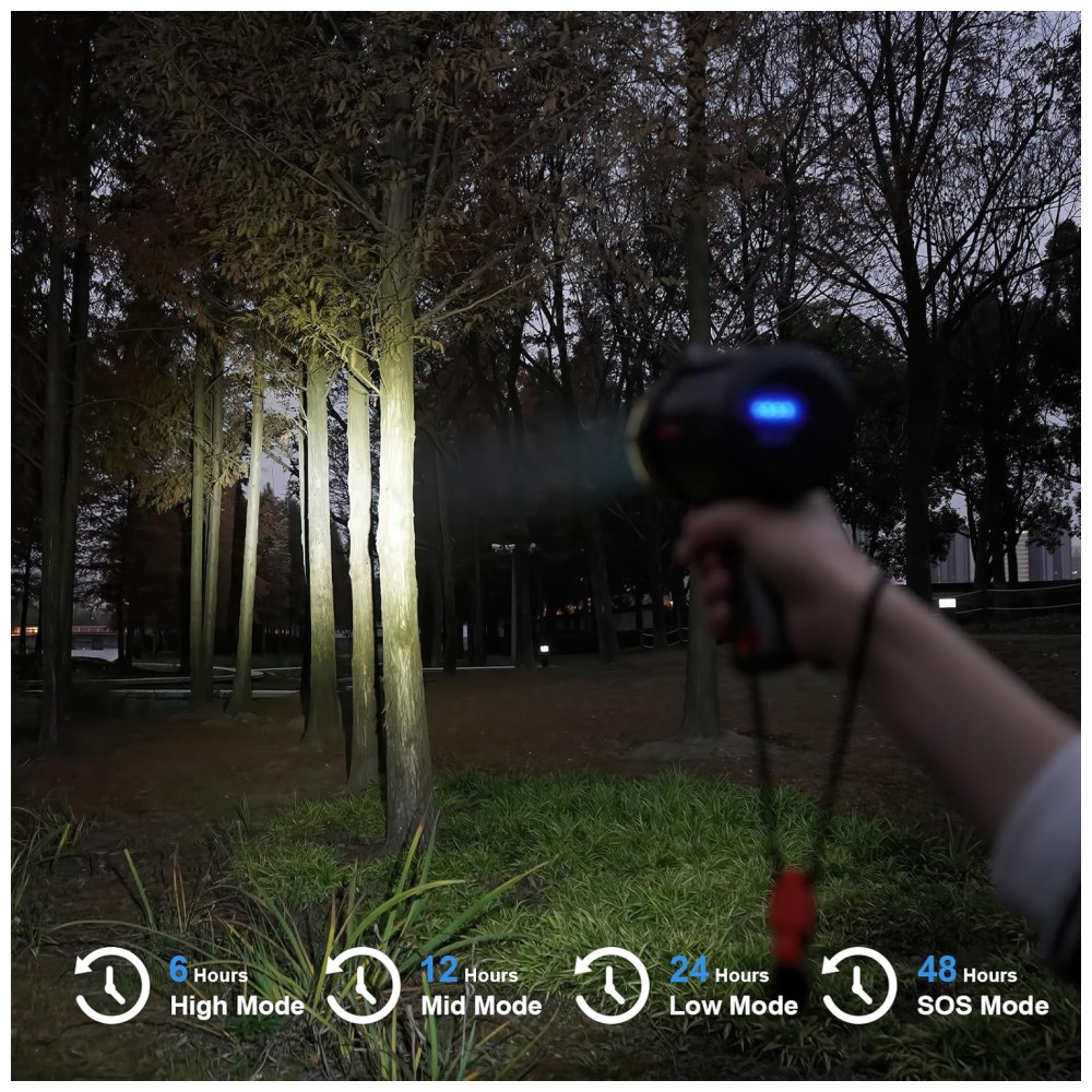 RECARREGÁVEL E PORTÁTIL Este holofote portátil de 2.000 lúmens vem com um adaptador doméstico de 100 V 240 V com cabo USB de 3,9 pés, 1 m. Este refletor portátil à prova dágua funcionará de 6 a 6,5 horas no modo alto, também pode ser como um banco de energia para carregar seus dispositivos inteligentes