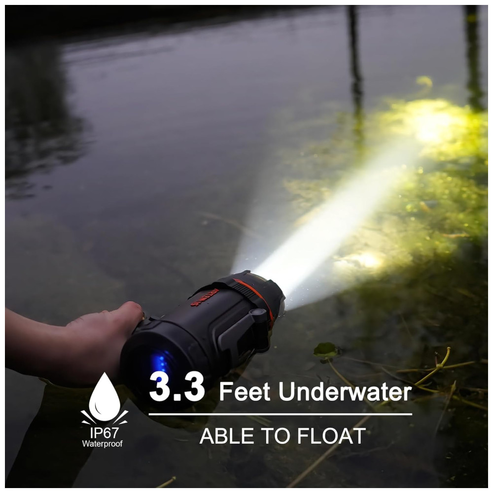 MARINE FLASHLIGHT Este refletor LED recarregável à prova dágua possui brilho de 2.000 lúmens, é recarregável e leve, com grau de impermeabilização IP67 que é capaz de flutuar debaixo dágua