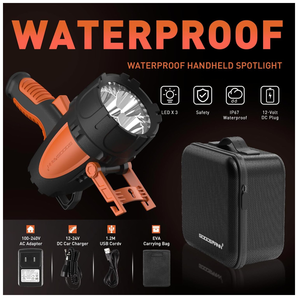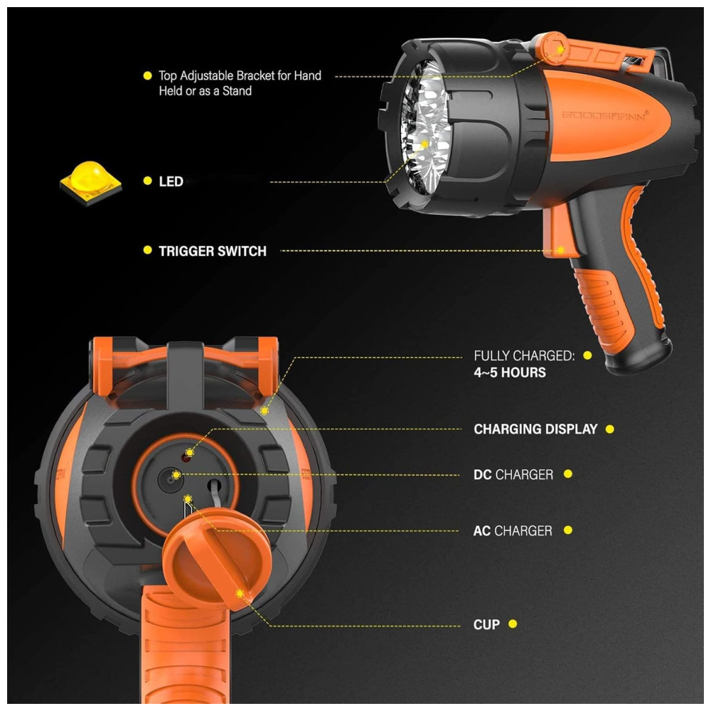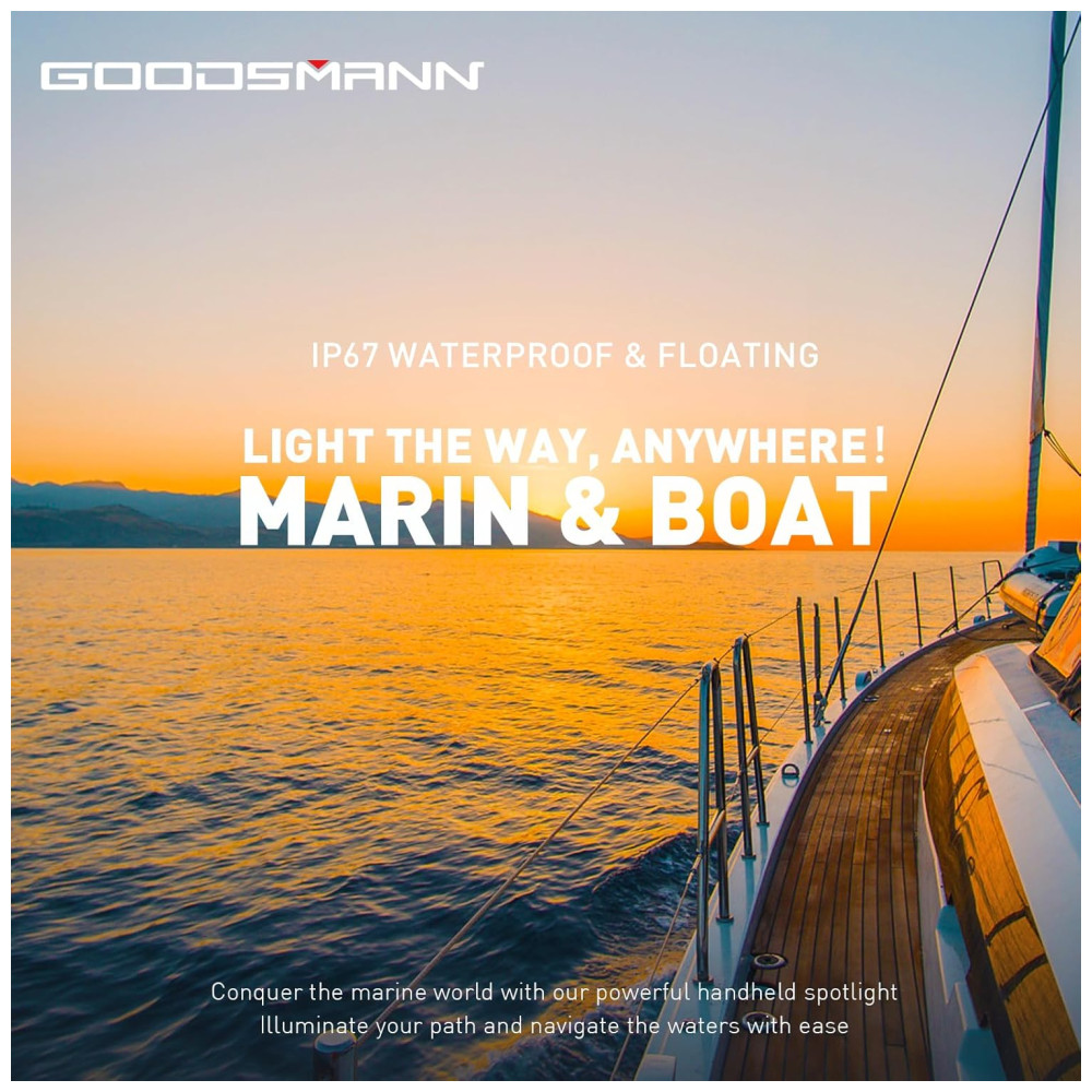 PROJETO IMPERMEÁVEL. O Refletor recarregável GOODSMANN é feito de tecnologia à prova dágua IP67. O seu design pode fazer com que este refletor flutue na água. Sua parcimônia geral de design parece ser ágil