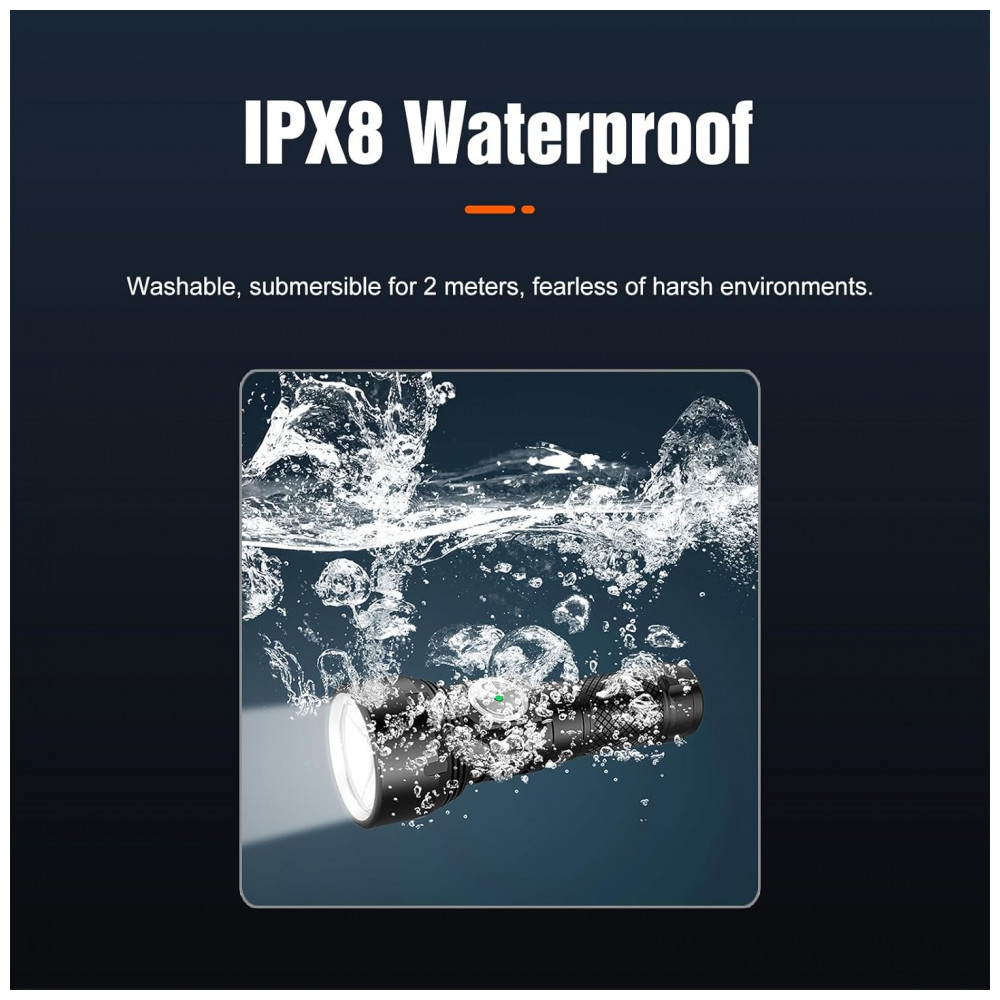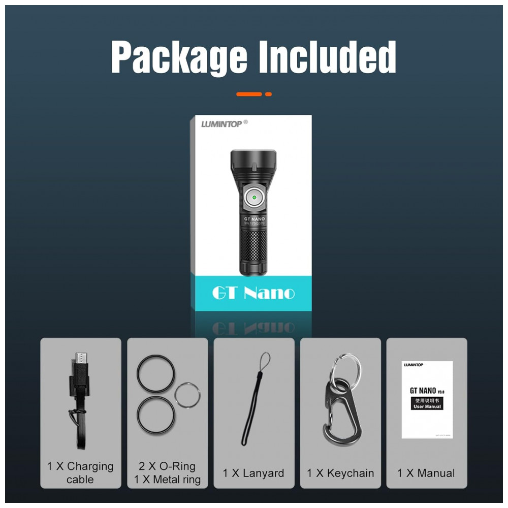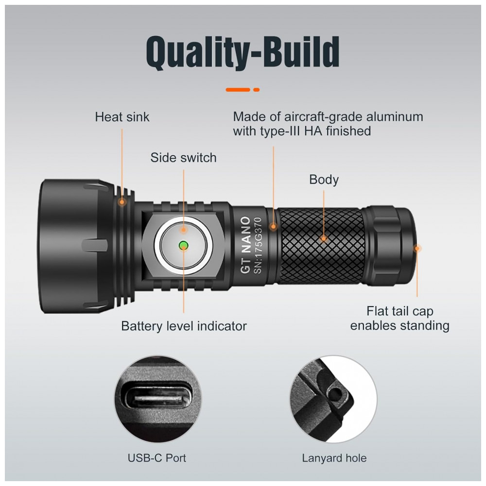 Compacta e durável Esta mini lanterna é feita de alumínio areocraft de alto grau, com refletor de alumínio, lente de revestimento anti reflexo, acabamento em anodização de capa dura tipo III, fios perfeitos, resistência ao impacto de 1,5 metros, IPX 8 à prova dágua. Todos os seus principais desempenhos são verificados e aprovados pelo padrão ANSI F1 American National Standard. Não há nenhuma luz 10180 que sequer se aproxime do GT NANO.
