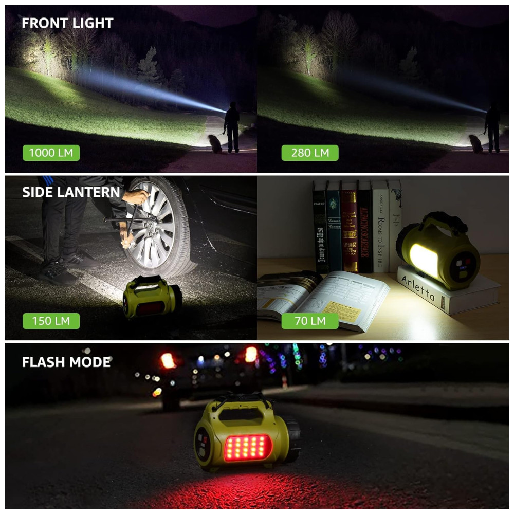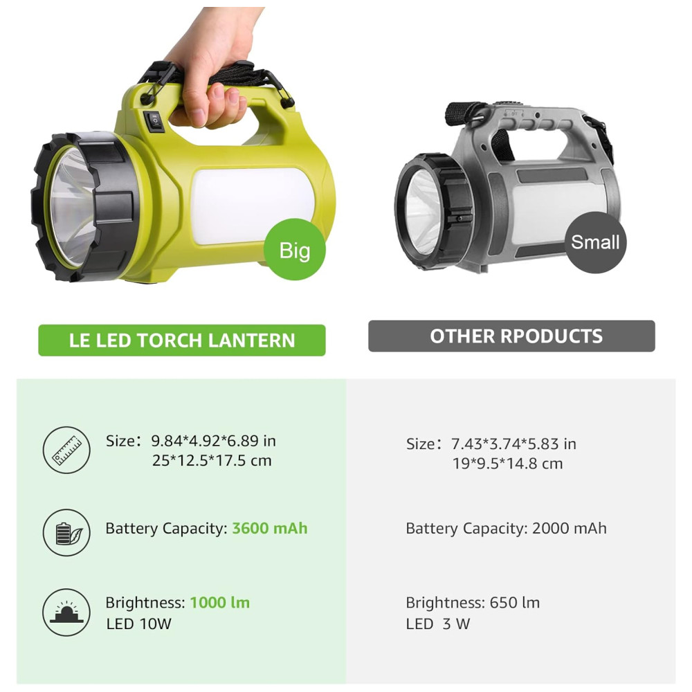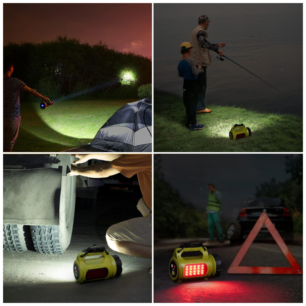 Super atualizado. Esta lanterna de configuração equipada CREE T600, brilho de luz LED de 10 lúmens e 5 modos de luz. Além disso, a distância de irradiação é de até 5 metros. Impermeável e leve. A holofote IP pode ser protegida de respingos de água em todas as garantias como suporte. Comparado ao seu tamanho enorme, pesando apenas 850 gramas, o que torna fácil para crianças pegá lo e utilizá lo. Banco de energia recarregável e 3600mAh. A luz de acampamento também pode servir como um banco de energia de 3600mAh para smartphones ou dispositivos móveis em emergência. Suporte cabo USB incluído e adaptador de carregador de 5V DC não incluído, não é compatível com o adaptador com tensão acima de 5V. 5 modos de iluminação. Com o modo holofote frontal 400 100lm, modo 70 130lm e modo intermitente vermelho do lado, como sendo o aplicável a cenários de ciclismo, camping, corrida, pesca, lendo, consertando carro, corrida etc