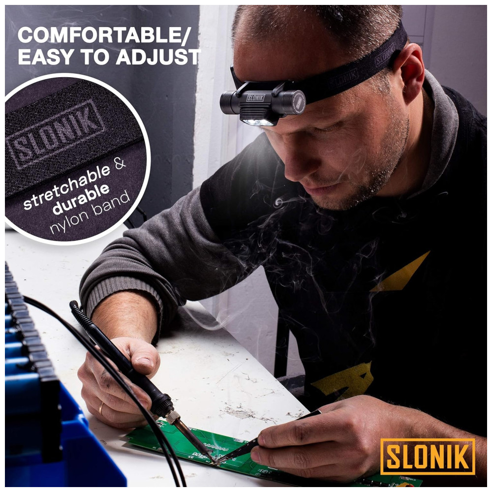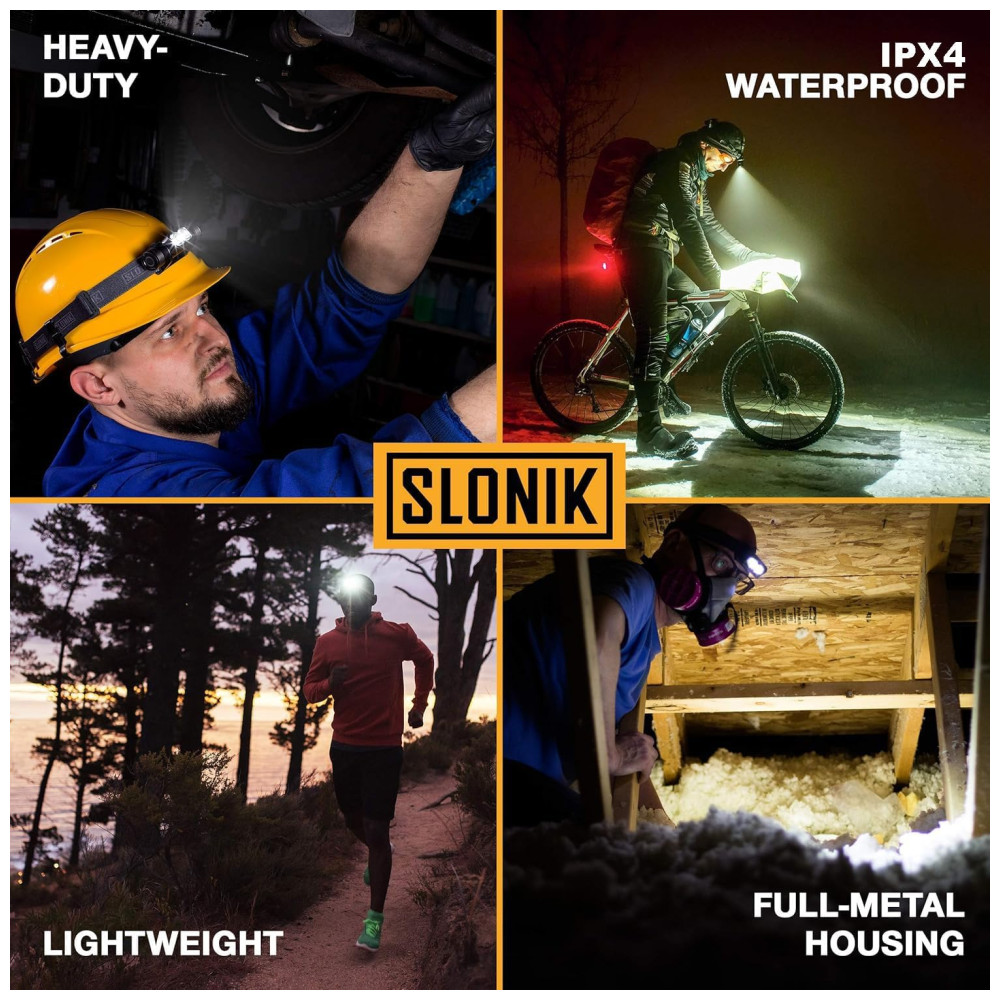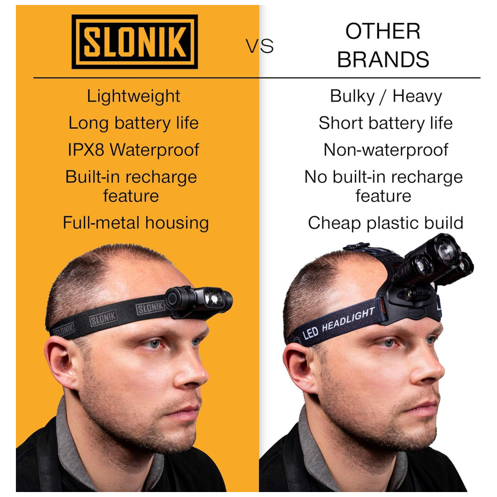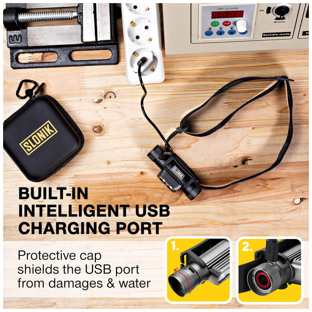 FAROL DE LED SUPER BRILHANTE E PODEROSO Conheça o farol Slonik atualizado de 3 geração. Este farol recarregável de 1000 lumens possui um feixe de luz de 200 metros e uma combinação de amplo e holofote com 120 graus de iluminação. Alterne entre os diferentes níveis de brilho com um único botão.
