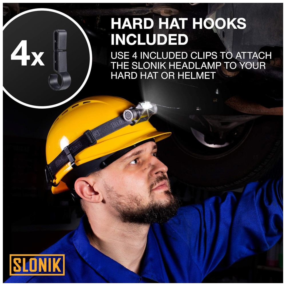 FEITO PARA EXTREMOS Luz de capacete Slonik feita de liga de alumínio de grau aerodinâmico 6063 e vidro temperado resistente a impactos para as condições mais extremas. Possui graus IPX8 à prova dágua e à prova de poeira. Perfeito para uso pessoal e industrial corrida, caminhada, camping, caça, trabalho de garagem, HVAC, construção, etc. Vem com 4 clipes de capacete.