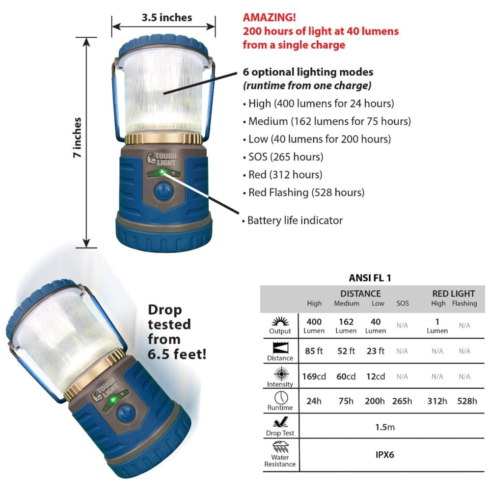 ECONOMIZE DINHEIRO Até 50.000 horas de uso, o equivalente a comprar 6.250 baterias D. 2 CABOS INCLUÍDOS, BLOCO DE CARREGADOR NÃO INCLUÍDO A unidade pode ser carregada a partir de qualquer bloco de carregador USB. O mesmo carregador USB para seu smartphone, tablet ou câmera digital também funcionará para carregar a Tough Light. Você pode carregá lo no carro usando qualquer carregador USB de 12 volts DC ou a partir da porta USB do laptop. Os 2 cabos USB Tough Light fornecidos possuem extremidades macho mais longas para um encaixe mais 2 cabos incluídos. PODER INCRÍVEL 400 Super Bright Lúmens com uma bateria Premium de 6000mAh Li ion. A unidade cobra uma taxa por 9 meses ou mais quando não estiver em uso. Basta carregá lo duas vezes por ano e ele estará sempre pronto para você em caso de emergência. SURPREENDENTE 16.6 NOITES DE LUZ POR UMA ÚNICA CARGA 200 horas na configuração BAIXA RECURSOS DE EMERGÊNCIA INCLUEM, SOS BEACON LUZ por 265 horas e PERIGO VERMELHO PISCANDO por 526 horas. Carrega telefones celulares e câmeras para emergências e conveniência, enquanto desfruta do ar livre. Em caso de emergência, as primeiras coisas que você precisa são leves e um celular carregado. RESISTENTE À ÁGUA E À QUEDA Os moldes de borracha e plástico de classe militar com O rings de borracha incorporados oferecem resistência à água IPX 6 para lidar com condições de chuva. Esta luz resistente é durável e pode lidar com uma queda de 1,5 m sem danos