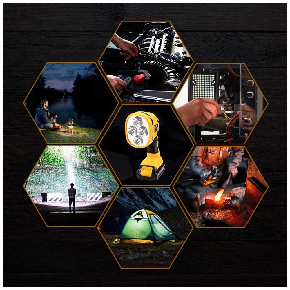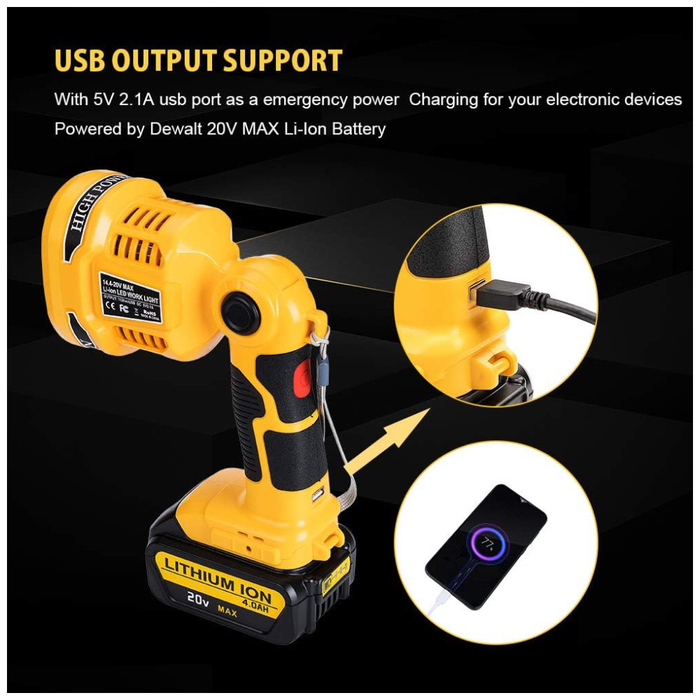 Compatível com bateria Dewalt Luz de trabalho LED Hipoke compatível com todas as baterias de íons de lítio Dewalt 20V MAX DCB205 2 DCB204 2 DCB206 2 DCB203 DCB204 DCB205 DCB206 DCB201 etc. Equipado com porta USB 5V , 2.1A, este refletor LED pode carregue seu telefone, tablet e outros dispositivos eletrônicos, como um adaptador de bateria.