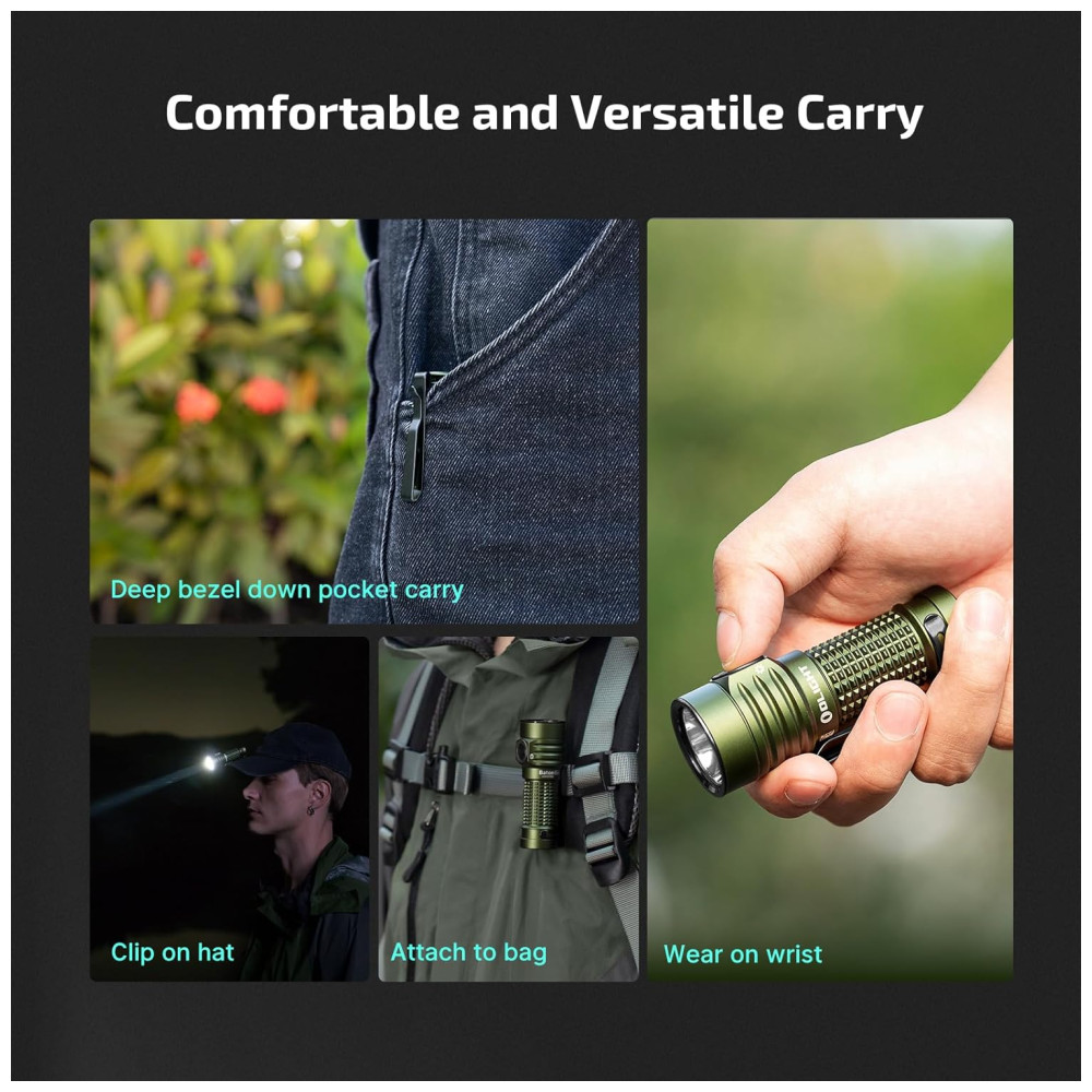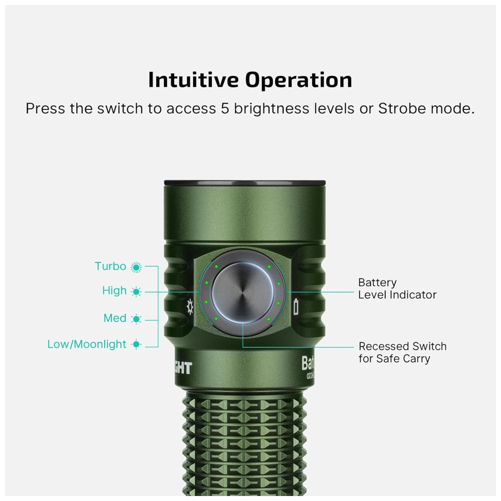 A Lanterna de Mão Recarregável OLIGHT Baton Turbo EDC oferece potência e versatilidade incomparáveis. Com 1000 Lumens e alcance de 510 metros, é ideal para visibilidade prolongada. Seu design compacto conta com clip twoway e cordão para transporte fácil e variado. Possui interruptor de segurança, painel intuitivo de controle de brilho e níveis de energia. Com bateria recarregável personalizada, garantindo autonomia de até 50 dias no modo Moonlight. Uma lanterna potente que atende às suas necessidades em diversas situações!