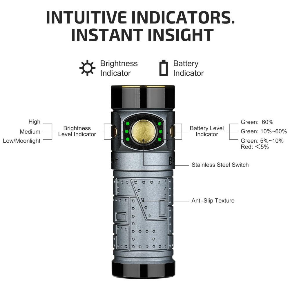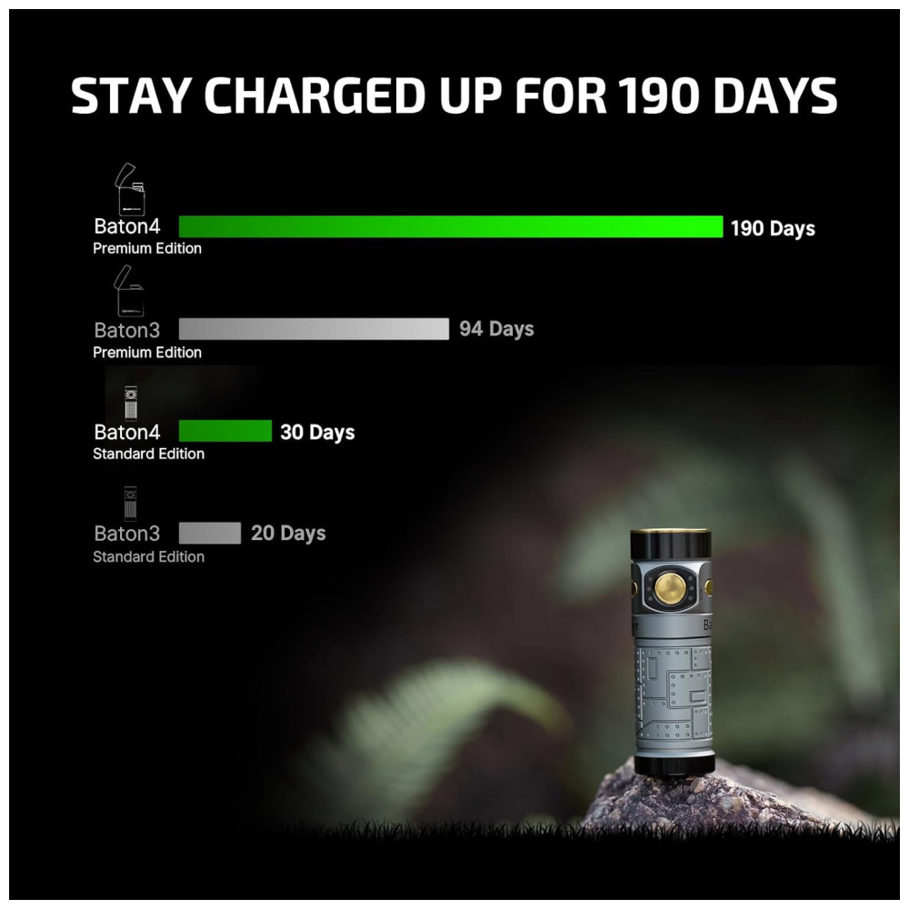 Pequena, porém poderosa, a lanterna EDC Baton4 tem uma saída máxima de 1.300 lumens e alcance de luz de 170 metros. Possui ímã embutido e um clipe resistente para fixação em superfícies metálicas ou cintos. O case aprimorado oferece até 190 dias de tempo de funcionamento, totalmente compatível com o Baton3 e permite carregar o S1R II e o Perun 2 Mini. Com carregamento USBC, a lanterna pode ser facilmente carregada ou usada para carregar dispositivos móveis. Apresenta indicadores de brilho e vida útil da bateria, com botão de exibição digital para ajuste preciso do nível de bateria e brilho.