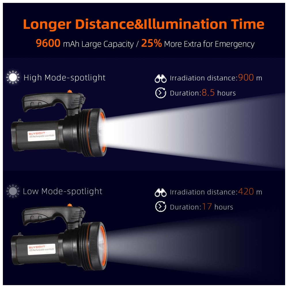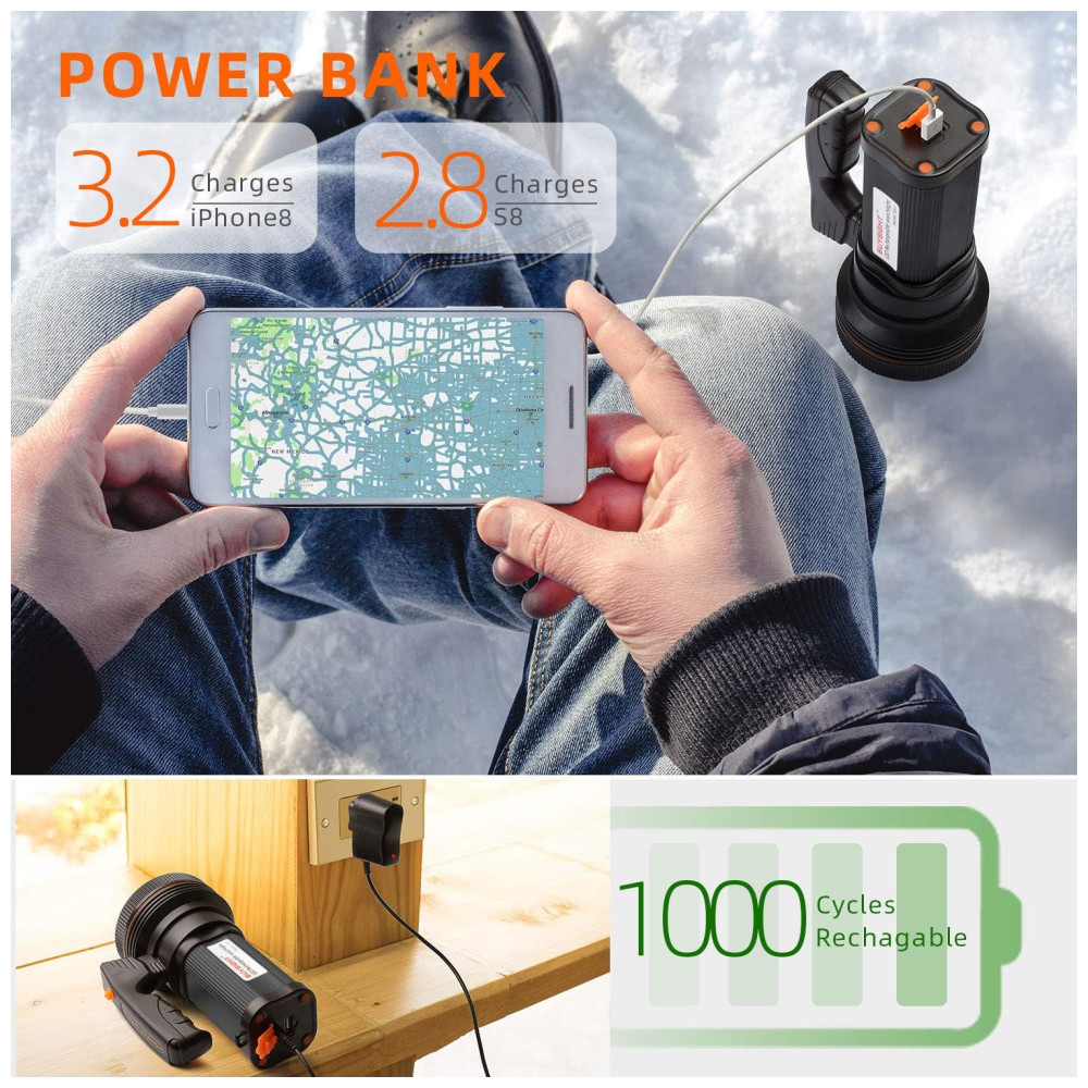 UMA LUZ DE ALTO PODEROSO ONDE VOCÊ PRECISA MAIS. Luz LED ultra brilhante CREE XHP 70.2 de 35 Watts com 2 modos de brilho Alto 6.000 lúmens, Baixo 2500 lúmens. Com 6.000 lúmens, é significativamente mais brilhante que muitos refletores e lanternas de preço mais alto. Iluminação de alcance ultralongo até 800 metros. A torna uma lanterna de spot de longa distância. Além disso, é um poderoso holofote de acampamento e luz de aviso. UM FAROL RECARREGÁVEL COM SÉRIE DURABILIDADE MAIS DE 20 HORAS ALTO BRILHO. NÃO É PRECISO PAGAR PELAS BATERIAS. Este holofote atualizado é fabricado com uma bateria recarregável de íon de lítio de 4,3 volts 18650 de longa duração e grande capacidade 9600 mAh, com duração 50 mais longa do que qualquer outro holofote de última geração. IMPACTO RESISTENTE E IMPERMEÁVEL. Feito de um plugue impermeável de borracha e ABS resistente e resistente a impactos para proteger o sistema contra riscos, quedas, solavancos e respingos. Se você encontrar chuvas durante caminhadas, acampar, velejar ou caçar, não se preocupe é o IPX 6 à prova dágua IMPACTO RESISTENTE E IMPERMEÁVEL. Feito de um plugue impermeável de borracha e ABS resistente e resistente a impactos para proteger o sistema contra riscos, quedas, solavancos e respingos. Se você encontrar chuvas durante caminhadas, acampar, velejar ou caçar, não se preocupe é o IPX 6 à prova dágua
