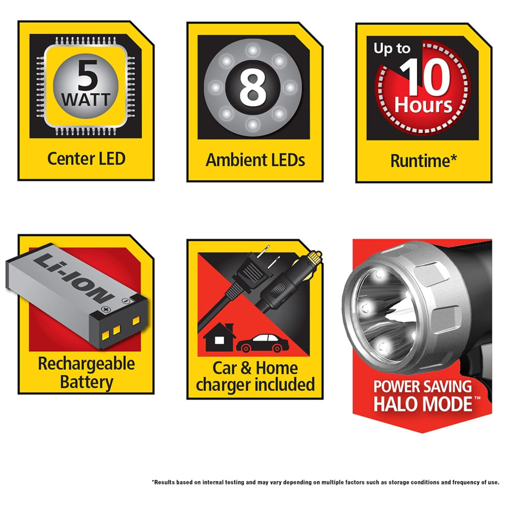 Oferece até 900 lúmens com LED ultra brilhante de 5W possui 5 modos de iluminação Completo, alto, baixo ou halo que usa luzes LED de 8 áreas a alça resistente à pistola oferece uma aderência conveniente e confortável O suporte giratório e o bloqueio do gatilho fornecem operação com as mãos livres a bateria de lítio permanece carregada por até 12 meses sem recarga Tempo de execução de até 10 horas Inclui adaptadores de carregamento CA e CC para recarregar em casa ou dentro de um veículo