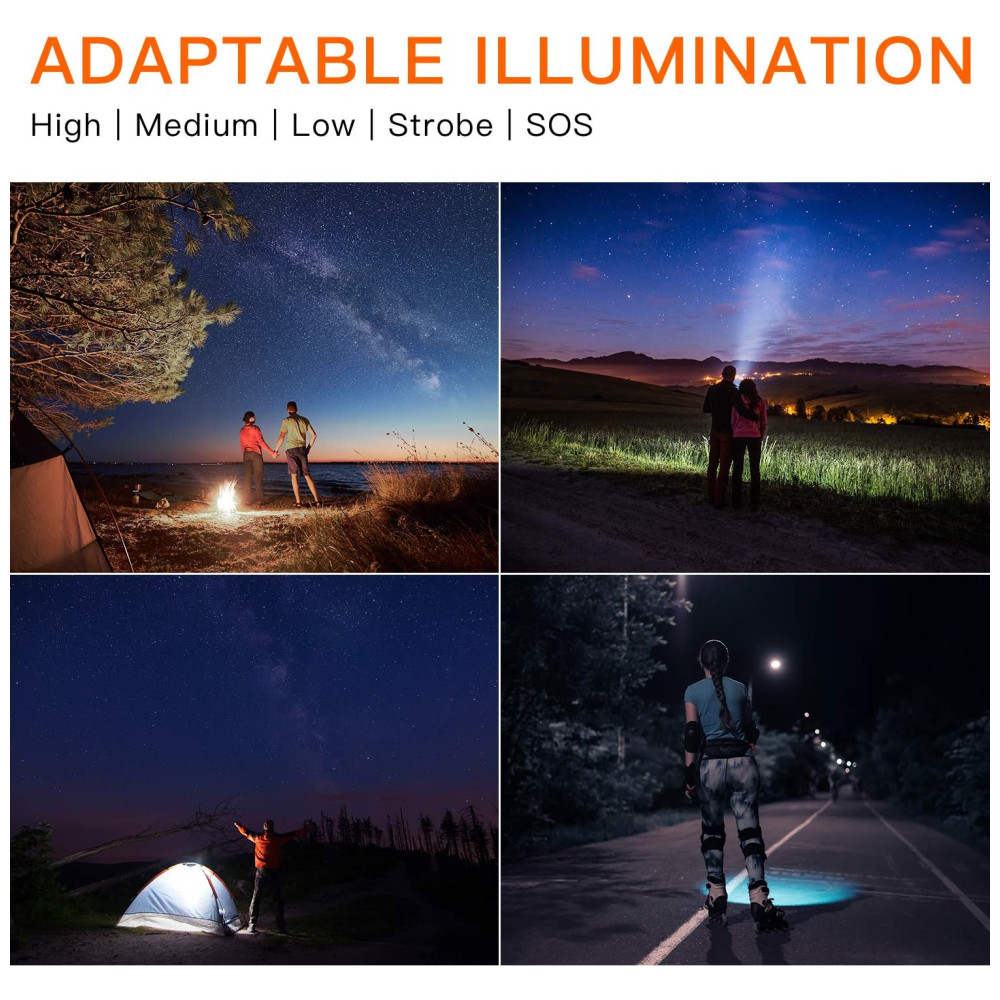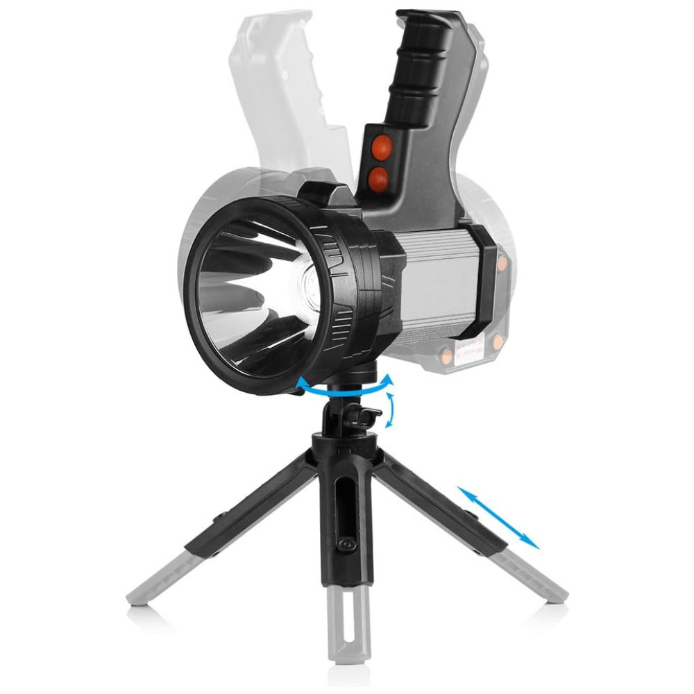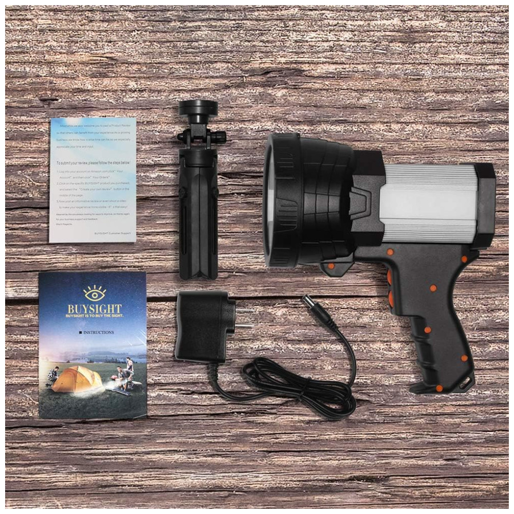 Refletor de lanterna grande super brilhante Luz principal e lúmens altos Luz lateral da luz de trabalho de inundação com função de aviso de luz vermelha e azul 6000 lúmens. Poderoso CREE XHP 70.2 LED Beads com 3 modos de brilho forte, fraco, o SOS faz dele um projetor de longa vida útil com alto lúmen. A luz lateral multifuncional permite que você a use como luz de acampamento e luz de aviso em condições de neblina. Interruptor de Design e Invólucro Aeroespacial em Liga de Alumínio o tamanho maior e o material mais macio tornam mais fácil a pressão de nosso interruptor, proporcionando uma sensação confortável à mão. O circuito piloto reduziu o tempo de reação e aumentou a vida útil do interruptor. Feita com metal sólido mas leve, nossa lanterna tática de mão é perfeita para seu uso a longo prazo em várias cenas ao ar livre sem cansaço. Em comparação com outros holofotes recarregáveis, nossa lanterna grande não é fácil de quebrar e rachar. Nossos holofotes recarregáveis da BUYSIGHT são testados para atingir o padrão de 1000 CICLOS. Duração da bateria e 100.000 horas de vida útil do cordão. Modo de luz de trabalho de inundação de acampamento ao ar livre Com suporte. Modo de correias. Modo de mão quando você vai acampar e fazer churrasco, nossa lanterna de acampamento pode perfeitamente libertar suas mãos. Baterias recarregáveis de grande capacidade e fonte de alimentação portátil de emergência a capacidade da bateria de até 9000mAh pode proporcionar um longo tempo de trabalho ao ar livre. A proteção múltipla inteligente proteção contra sobrecarga , descarga excessiva pode mantê la segura e estável quando você a usa como energia móvel para carregar seus dispositivos inteligentes