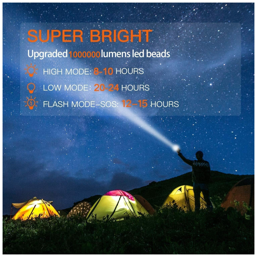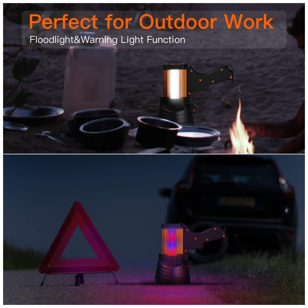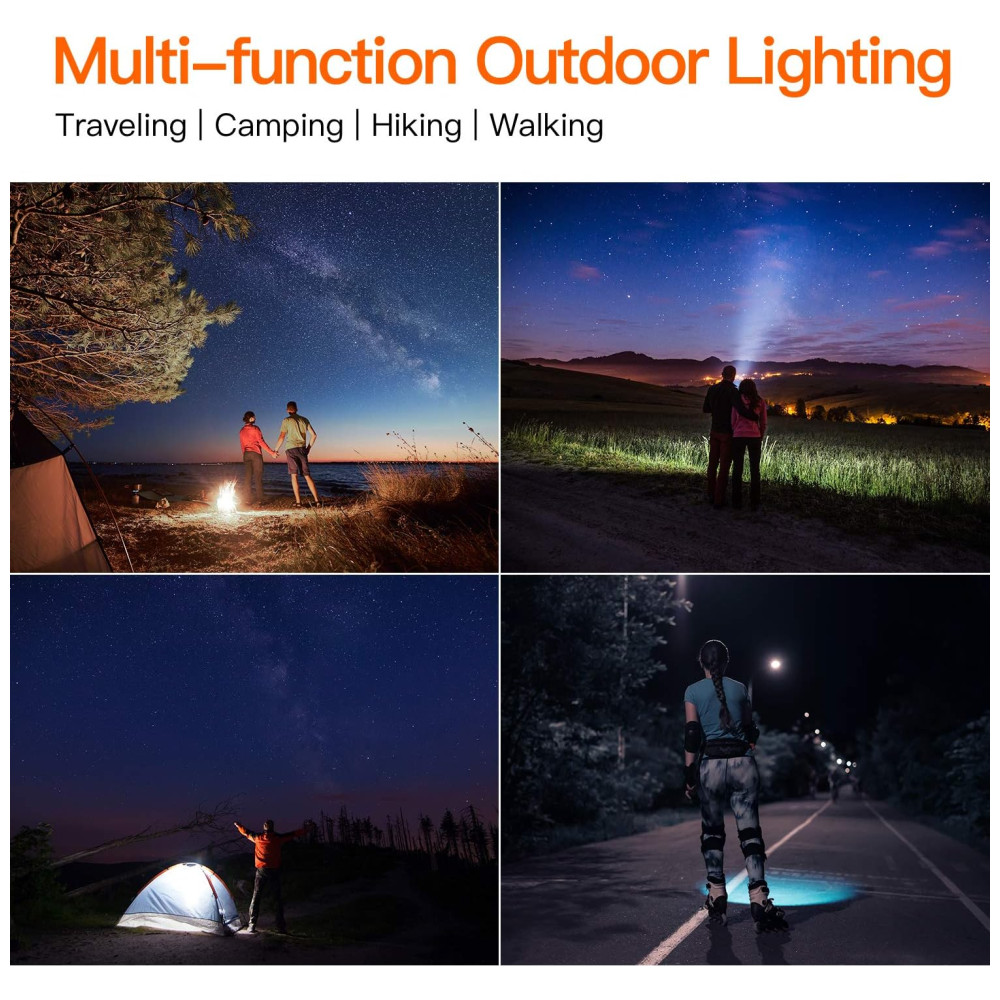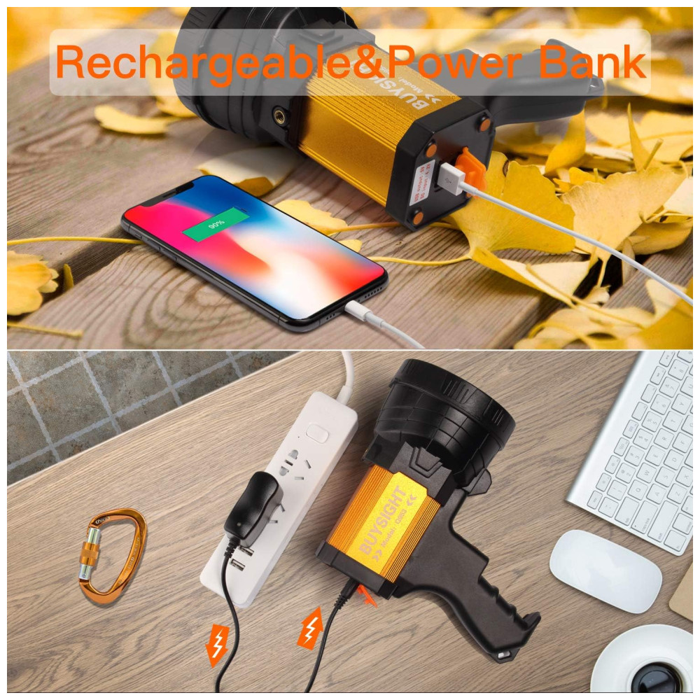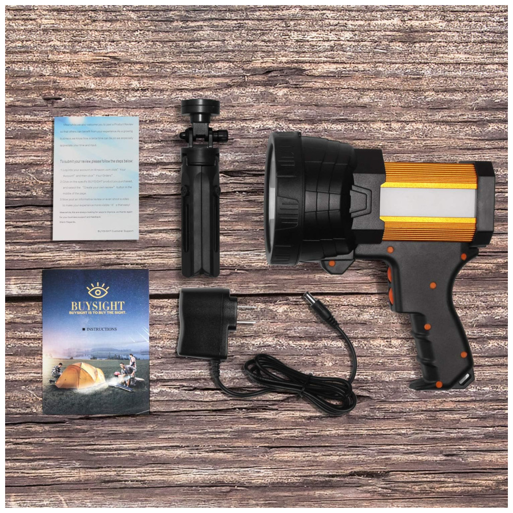 Refletor de lanterna grande super brilhante. Luz principal e lúmens altos. Luz lateral da luz de trabalho de inundação com função de aviso de luz vermelha e azul 6000 lúmens. Poderoso CREE XHP 70.2 LED Beads com 3 modos de brilho forte, fraco, o SOS faz dele um projetor de longa vida útil com alto lúmen. A luz lateral multifuncional permite que você a use como luz de acampamento e luz de aviso em condições de neblina. Interruptor de Design e Invólucro Aeroespacial em Liga de Alumínio o tamanho maior e o material mais macio tornam mais fácil a pressão de nosso interruptor, proporcionando uma sensação confortável à mão. O circuito piloto reduziu o tempo de reação e aumentou a vida útil do interruptor. Feita com metal sólido mas leve, nossa lanterna tática de mão é perfeita para seu uso a longo prazo em várias cenas ao ar livre sem cansaço. Em comparação com outros holofotes recarregáveis, nossa lanterna grande não é fácil de quebrar e rachar. Nossos holofotes recarregáveis da BUYSIGHT são testados para atingir o padrão de 1000 CICLOS. Duração da bateria e 100.000 horas de vida útil do cordão. Modo de luz de trabalho de inundação de acampamento ao ar livre Com suporte. Modo de correias. Modo de mão quando você vai acampar e fazer churrasco, nossa lanterna de acampamento pode perfeitamente libertar suas mãos. Baterias recarregáveis de grande capacidade e fonte de alimentação portátil de emergência A capacidade da bateria de até 9000mAh pode proporcionar um longo tempo de trabalho ao ar livre. A proteção múltipla inteligente proteção contra sobrecarga , descarga excessiva pode mantê la segura e estável quando você a usa como energia móvel para carregar seus dispositivos inteligentes
