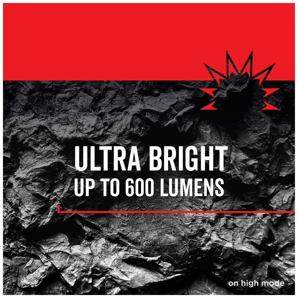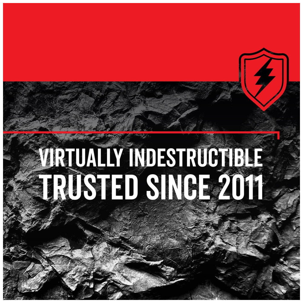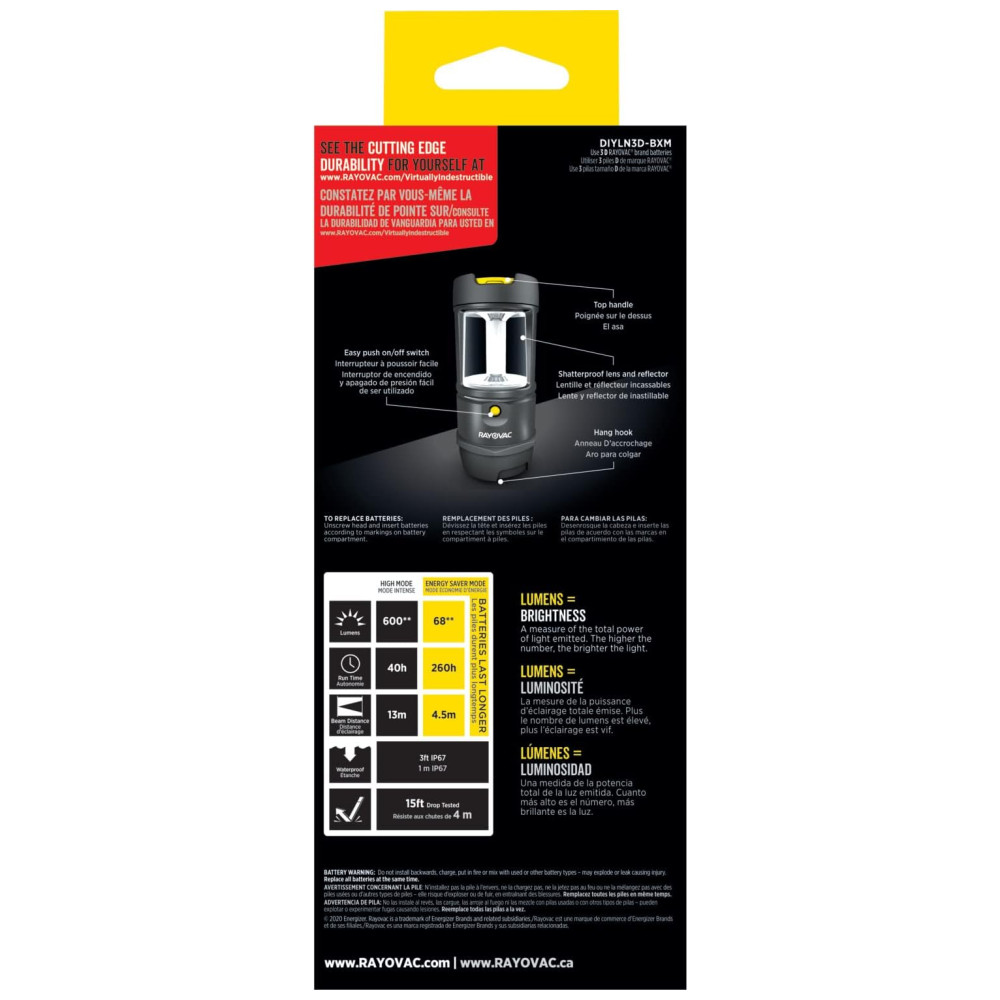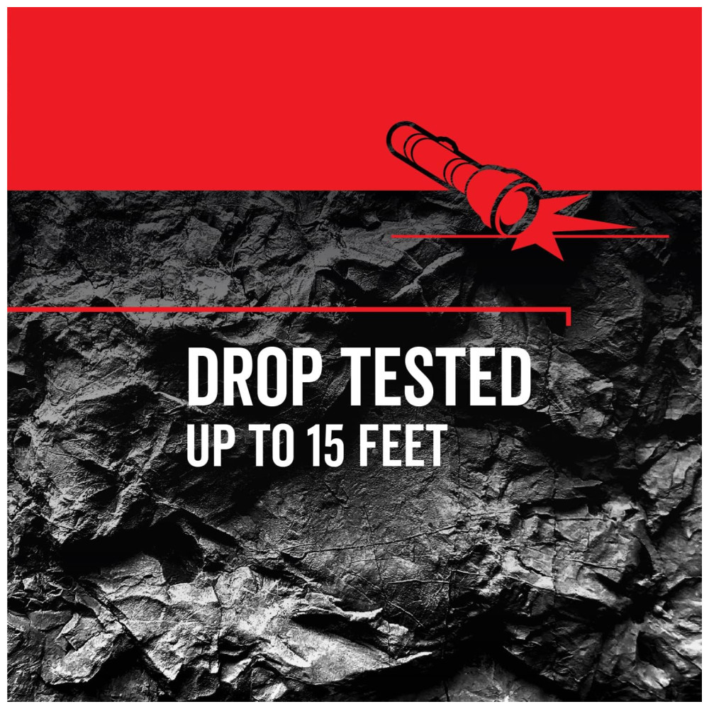 ULTRA BRIGHT Ilumine seu espaço de trabalho com até 600 lúmens no modo alto TESTADO Suspeita quedas de até 5 metros devido a componentes à prova de estilhaços e um painel de borracha que absorve choques IP67 até 9mts de água por até 30 minutos MODOS VARIÁVEIS escolha entre 3 modos de luz de lanterna LED com o pressionar de um botão obtenha até 260 horas de desempenho no modo de economia de energia. Veja a durabilidade de ponta por si mesmo A lanterna LED virtualmente indestrutível de 600 lúmen faz o trabalho. É seu melhor amigo em churrascos noturnos no quintal, piqueniques no parque e onde quer que o trabalho o leve. Oferecendo até poderosos 600 lúmens e 128 mts de distância do feixe no modo alto, a Lanterna de Camping Virtualmente Indestrutível é uma companhia versátil para qualquer ocasião. Fique em campo por mais tempo com um modo de economia de energia que oferece até 260 horas de desempenho. A lanterna é testada em queda de até 5 metros para garantir que esteja com você a longo prazo. Além disso, é à prova dágua IP67, para que possa ser submerso em até 5mts de água por até 30 minutos. Também é à prova de poeira, protegendo os componentes mesmo quando cercado por uma nuvem de poeira por até 3 horas. Funciona com baterias 3 D incluídas