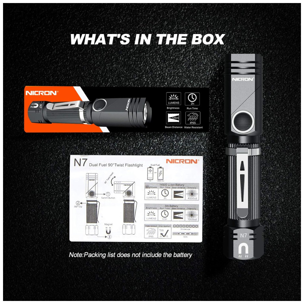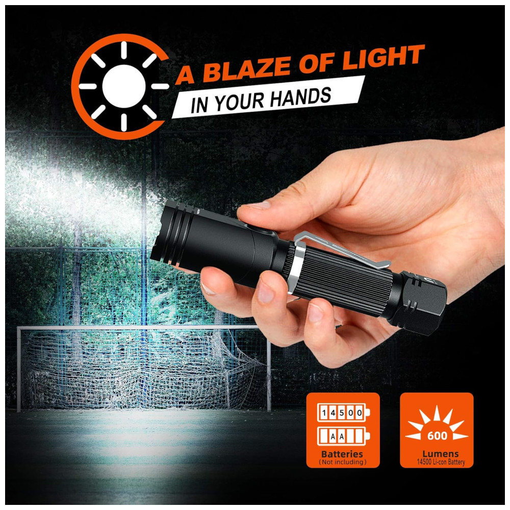 ULTRA BRILHANTE E DE LONGA DURAÇÃO. Ilumine com facilidade uma sala inteira ou iluminação em objetos a mais de 13 m de distância 10 vezes mais brilhante que as luzes incandescentes antigas. Lanterna de voltagem inteligente com bateria AA torna se 250 lúmens, usando a bateria recarregável 14500 torna se 600 lúmens Flashlight. Convenientemente alimentado por várias horas com uma única bateria AA ou uma bateria recarregável 14500. Não incluindo as baterias. ROTAÇÃO DE 90 GRAUS E TAMPA MAGNÉTICA DA CAUDA. Clip de tamanho pequeno e corpo em aço 4 configurações úteis alta baixa estroboscópio SOS é ideal para usar em casa, passear com cães. tampe a lanterna anexa firmemente a qualquer superfície de metal ferroso para uso gratuito, caça, camping ou pesca. É compacto o suficiente para caber no seu bolso, mochila ou bolsa. Resistente e confiável resistente à água com classificação IP65 e projetado para dias de chuva pesada. Compacta e resistente como unhas, esta lanterna pode sobreviver a uma queda de 1 metro ou ficar temporariamente submersa na água. Alguns revisores chegaram a colocá lo no freezer e atropelá lo com um caminhão e ele ainda funcionará Adequado para uso em chuva, neve ou situações de emergência. Configurações de economia de energia se não estiver em uso, recomendamos que você bloqueie a unidade apenas desaparafusando a tampa traseira algumas vezes. PROJETO ZOOMÁVEL INTELIGENTE O feixe focalizado expansível tem 10 m de compacto estreito a amplo para caber facilmente no seu bolso aonde quer que você vá e possui um acabamento antiderrapante que agarra rapidamente a sua mão. Permanece no final como uma fonte de luz de emergência