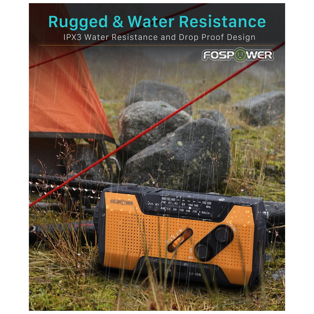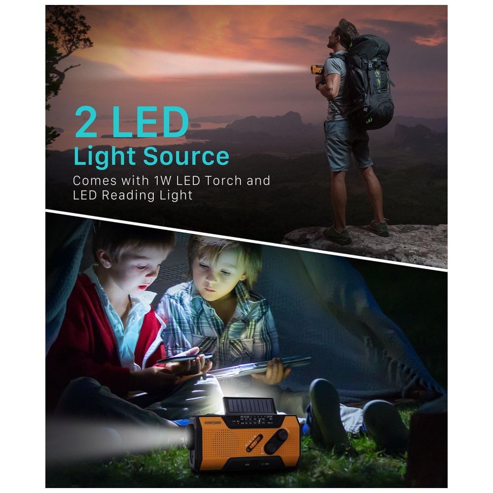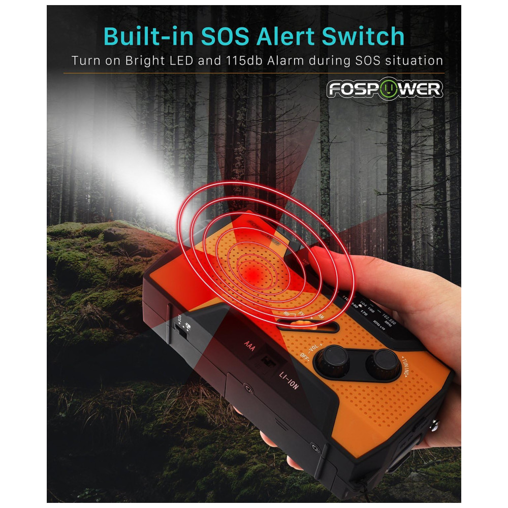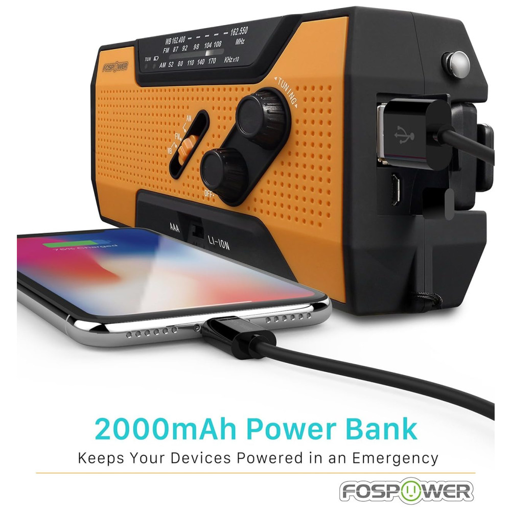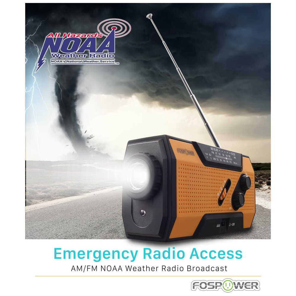 O BANCO DE ENERGIA 2000MAH MANTERÁ OS DISPOSITIVOS. O rádio de emergência da FosPower incorpora um banco de energia de 2000mAh capaz de fornecer energia de emergência a qualquer tablet ou telefone pequeno. 3 FONTES DE ALIMENTAÇÃO ENERGIA QUANDO NECESSÁRIO. Use as 3 fontes de energia do rádio meteorológico de emergência quando precisar de um aumento de energia ou recarregar o rádio. A alavanca de manivela do rádio e o painel solar são capazes de regenerar energia suficiente para manter o rádio, as luzes e o alarme SOS prontos para acionar quando você mais precisar. As pilhas AAA garantem que você tenha energia quando não conseguir regenerar a energia. 2 FONTES DE LUZ SEMPRE LIGADAS. O rádio da manivela de emergência também pode fornecer luz. A luz de leitura de 4 LED e a lanterna de 1W fornecem saída suficiente para manter você e seus entes queridos longe do escuro em uma situação de emergência. ACESSO AO TRANSMISSÃO DO TEMPO DE EMERGÊNCIA NOAA. O rádio receberá de maneira confiável até a segunda previsão do tempo de emergência e transmissões de notícias de emergência das estações NOAA e AM , FM