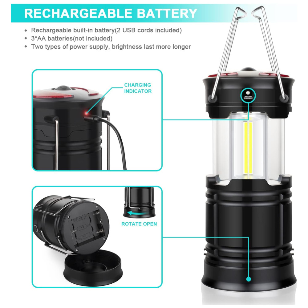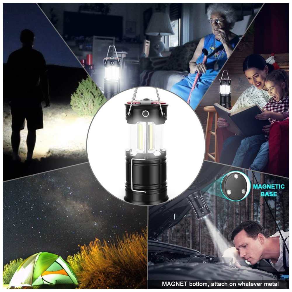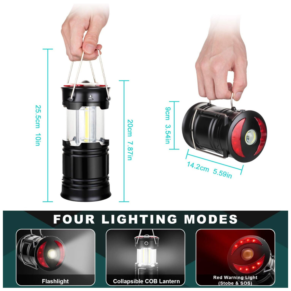 LUZ SUPER BRILHANTE As mais recentes lâmpadas COB oferecem luzes ultra brilhantes. A iluminação de cobertura de 360 graus fornece alta visibilidade para atender ao brilho da área grande. 4 modos de iluminação. Lanterna dobrável COB LED. Luz de aviso vermelha luz estroboscópica e SOS. A lanterna de acampamento led EZORKAS é uma ferramenta vital de sobrevivência arquivada e acessórios de acampamento. RECARREGÁVEL E DE LONGA DURAÇÃO É uma lanterna de acampamento recarregável alimentada por baterias. Há uma bateria 18650 embutida, para que você possa recarregar a lanterna via cabo de carregamento USB. Você também pode colocar 3 pilhas AA não incluídas para usá lo. Usando essas duas formas de fornecimento de bateria. A lanterna pode acender cerca de 30 horas ou mais. Nunca deixe você ficar em uma escuridão repentina. RESISTENTE À ÁGUA E DURÁVEL O corpo compacto da lanterna evita que seja danificado por colisão. A lanterna recarregável é resistente à água devido ao seu material militar ABS e lâmpada COB. A lâmpada Camping pode se adaptar a todos os tipos de furacões severos e clima de tempestade. Luz de acampamento perfeita para suas atividades internas ou externas. DESIGN LEVE O design dobrável pressionando e puxando a alça pode ligar ou fechar a lanterna recarregável. A lanterna portátil de metal pode ser usada como lanterna, o elevador vertical como lanterna e pode ser pendurada na árvore ou em outros. 3 Ímãs fortes na base podem ser adsorvidos em qualquer superfície metálica para liberar suas mãos. EZORKAS 2 Pack Upgrade Lanterna de acampamento recarregável Led Lanterna e farol em um, lanterna dobrável com bateria 18650. Equipamento de camping lanterna de backup para camping, furacão, caminhadas, mochila, pesca, emergência, leitura, interrupção, SOS etc. Flash vermelho como uma boa ferramenta de sobrevivência SOS para o perigo. Alças dobráveis facilitam o transporte e o transporte. A base do ímã será anexada à superfície mental para liberar as mãos. O corpo compacto da lâmpada o torna resistente à água e durável. Ele pode ser como uma lanterna ou uma lanterna. Seu design inovador multiuso é incrível. Características Iluminação ultra brilhante de 360 COB Poderosa 3W COB na parte inferior para fins de lanterna Alças dobráveis de design compacto e leve para fácil zenamento e suspensão Plástico resistente à água de nível militar Altura ajustável para controle de brilho eficiência de energia baixo consumo de energia Lanterna 3W e farol de emergência no fundo da lanterna superior com 3 ímãs, pode ser adsorvido em qualquer superfície de metal Ideia perfeita para presente de mãe, pai, família, amigos, amante, dia dos namorados Detalhe Material ABS Tipo de lâmpada COB Tamanho do produto 9x14cm Peso do produto 298g. Aviso NUNCA use o nestas condições 1. Condições subaquáticas. Evite deixar em condições molhadas. Aquecido serviço de alta temperatura. 3. Evite olhar diretamente para a luz