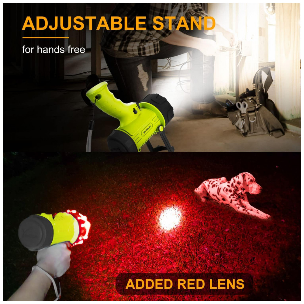 MAIS FUNÇÕES Suporte ajustável para iluminação mãos livres, como uma luz de trabalho e filtro vermelho removível para iluminação de caça. Este holofote é uma ferramenta de iluminação perfeita para trabalhar, acampar, passear de barco, caçar, etc