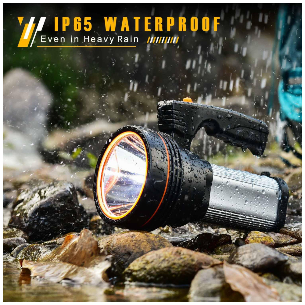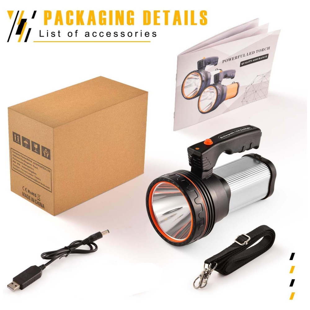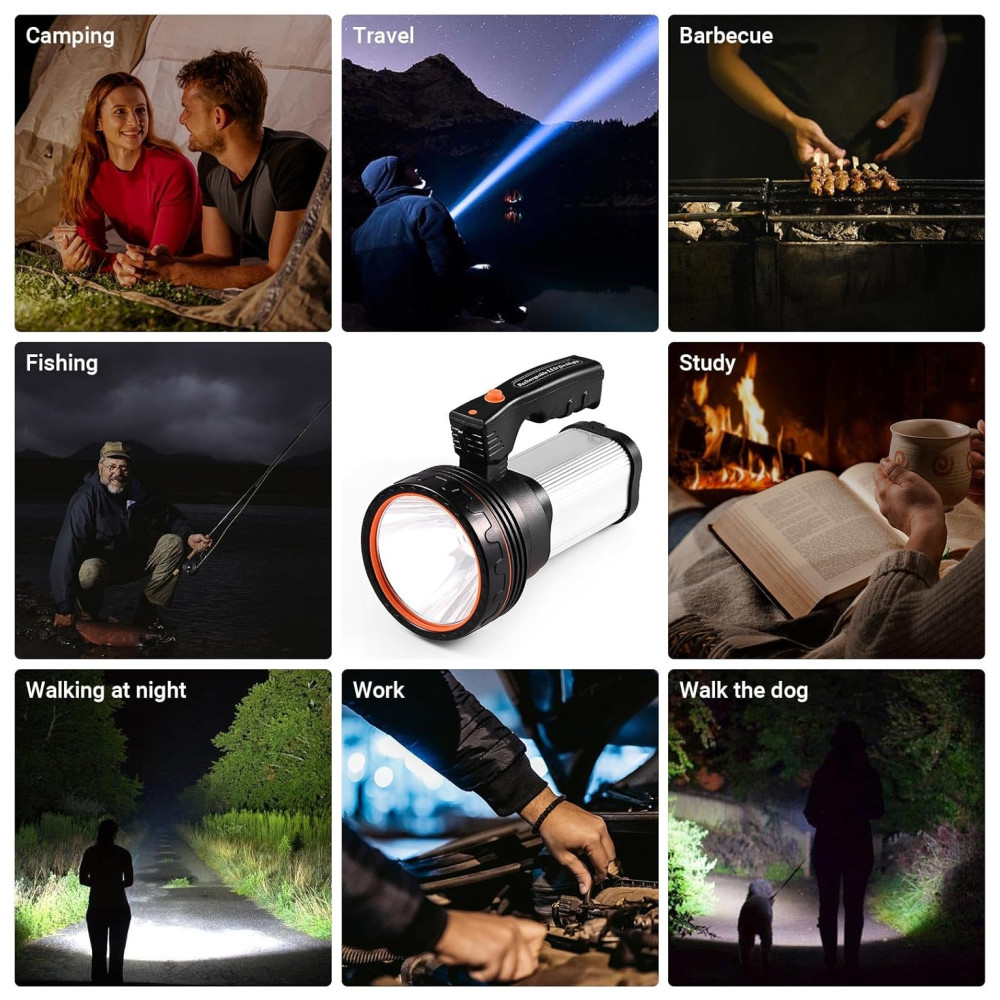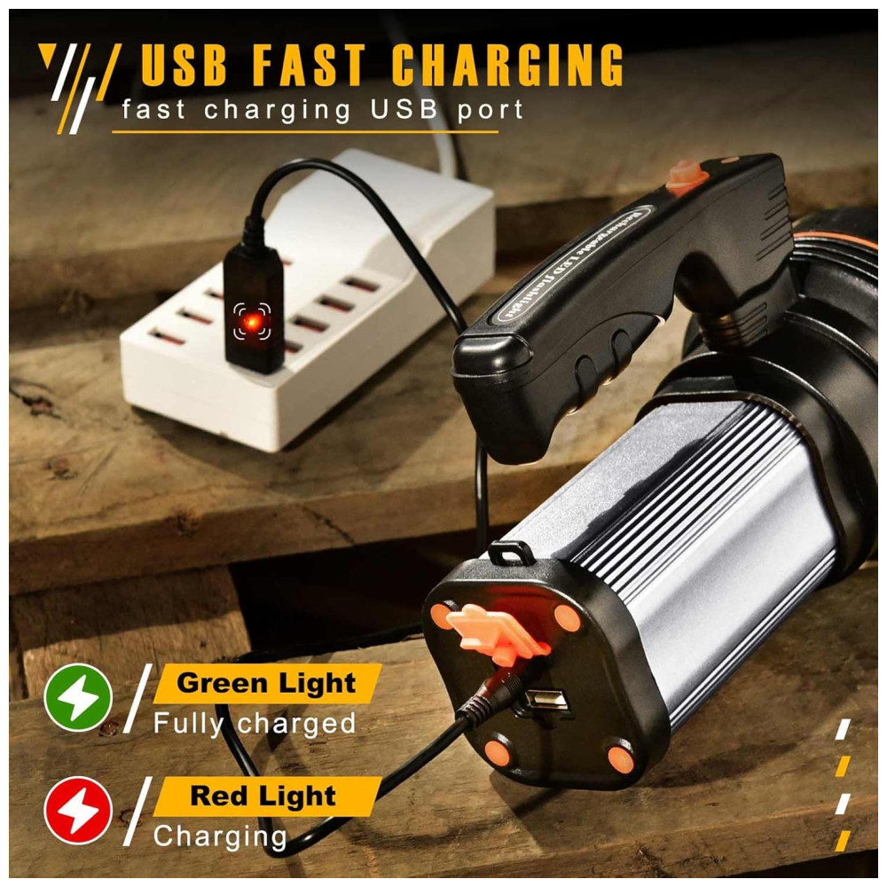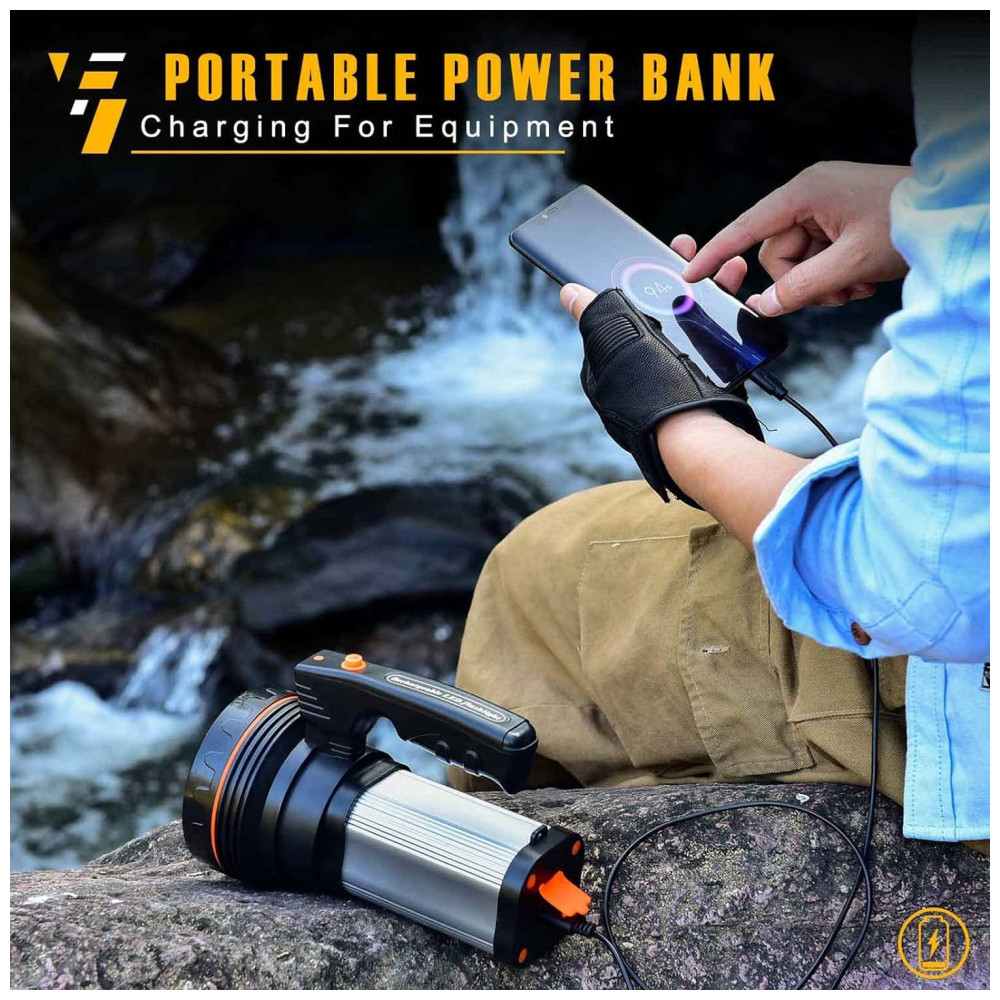 Lanternas de alto lúmen e brilho ajustável Esta fonte de holofote é de 8600 lúmen 2000 lúmen, o holofote pode ser iluminado a uma distância de mais de 8 campos de futebol aproximadamente 2600 pés , 800 m Esta lanterna recarregável é ótima para acampar, caminhar, caçar , explorando, passeando com cães, luz de emergência de furacão, tempestade e várias emergências.