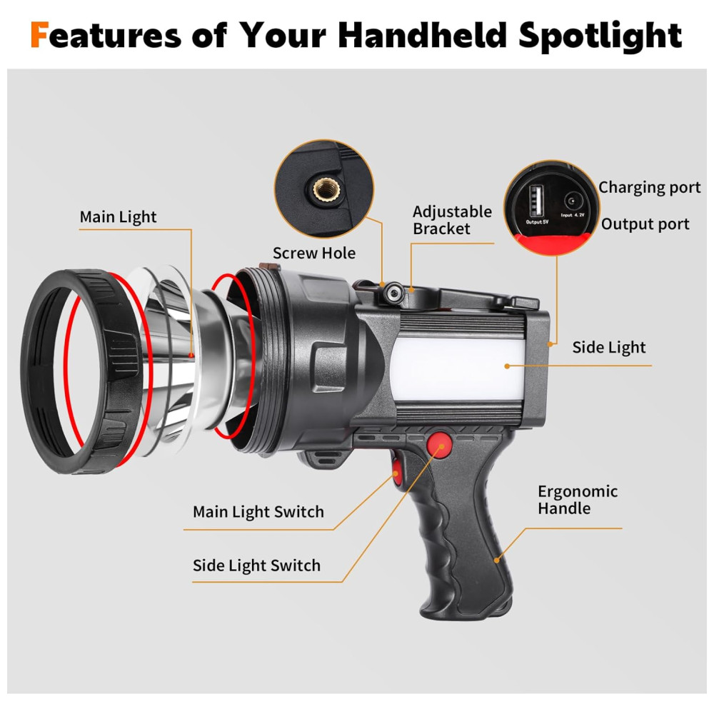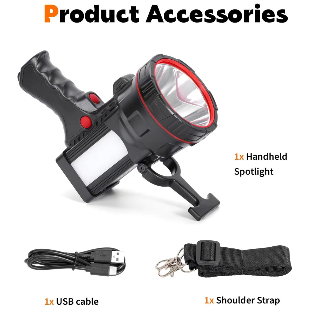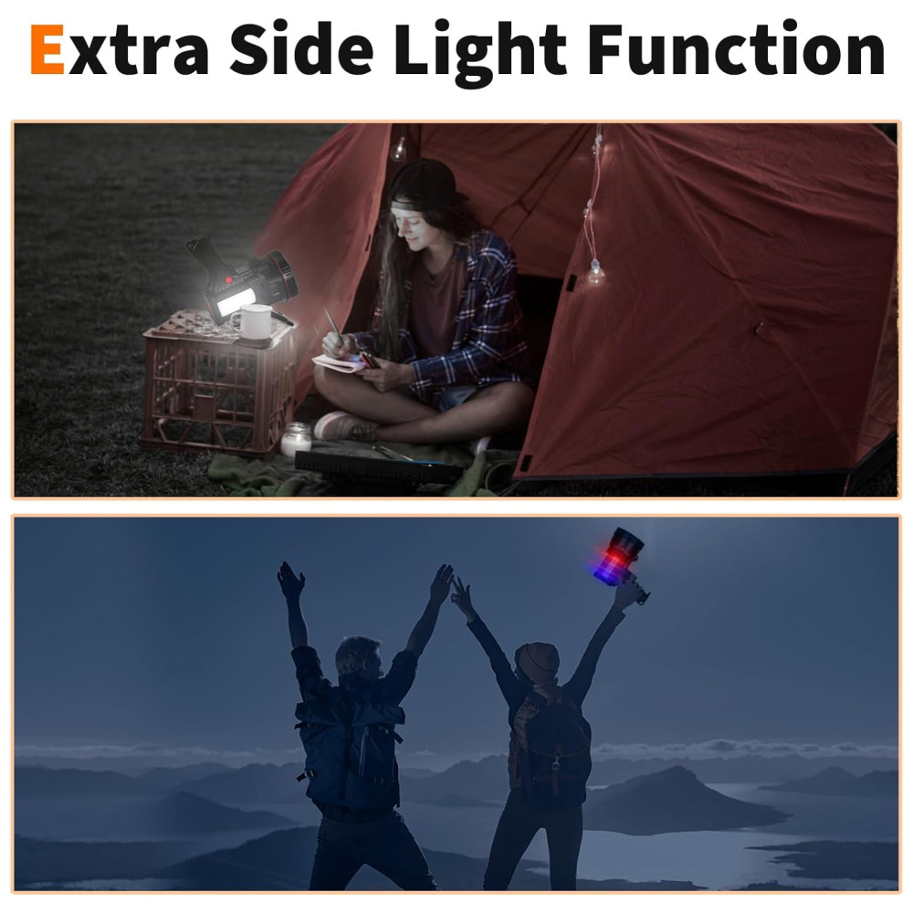 6 MODOS DE LUZ PROJETO LED super brilhante Luz portátil com 2 modos de luz Alto , Baixo , SOS , OFF , a distância de luz de até 1000M. O corpo com uma lâmpada lateral possui três modos de luz Alto , Baixo , SOS , OFF , pressione 3 segundos no modo Flash , SOS.