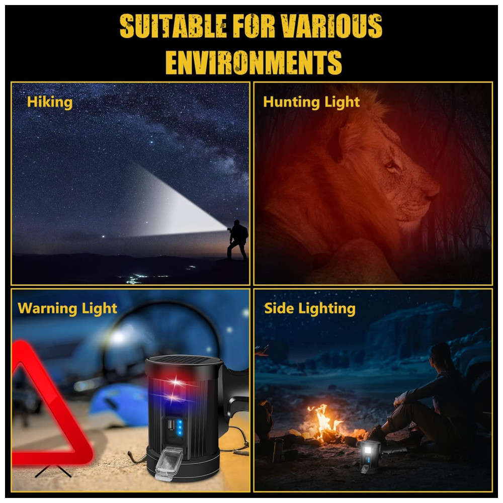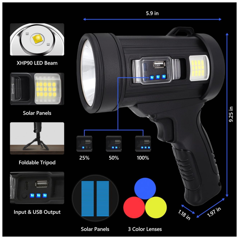 POR QUE ESCOLHER NOSSO SPOTLIGHT Convidamos 1000 aventureiros ao ar livre para experimentar nossos holofotes. Eles acham que pode ser o holofote mais brilhante do mundo, excelente duração da bateria, função de carregamento solar exclusiva, também pode ser como banco de potência, são seus olhos no escuro. Não há razão para que você não ame
