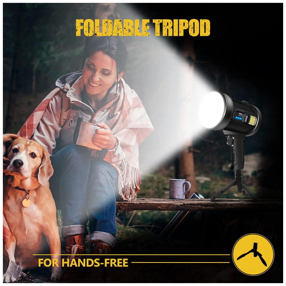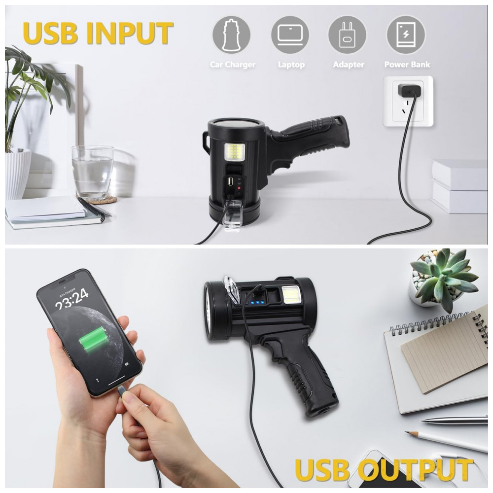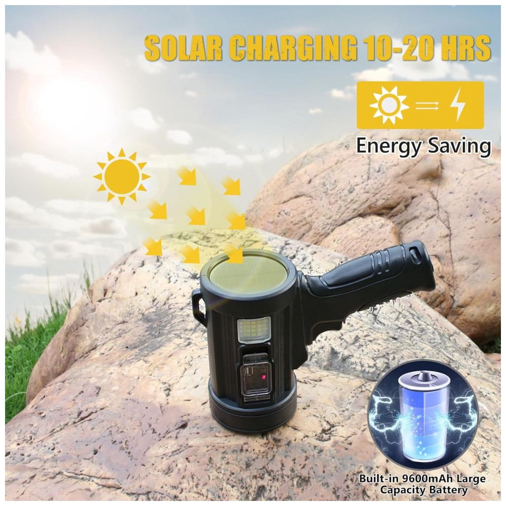 BATERIA DE ALTA CAPACIDADE O holofote recarregável é construído em uma bateria de 10000mAh de grande capacidade que funciona por 10 horas com brilho máximo. A luz do ponto dá lhe um longo tempo de trabalho ao ar livre. Pode ser carregado de carregador de parede USB, carregador de carro usb 4 5 horas ou energia solar 10 20 horas.