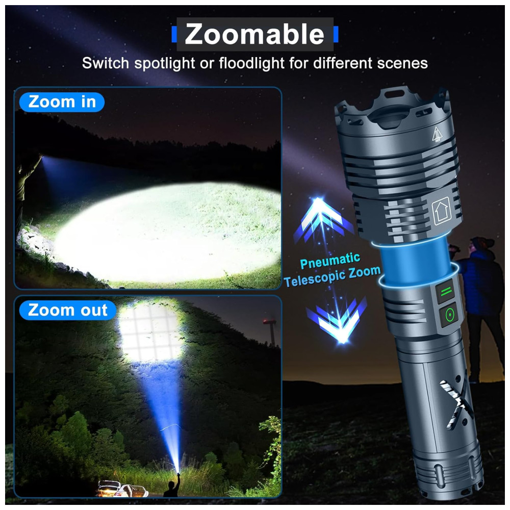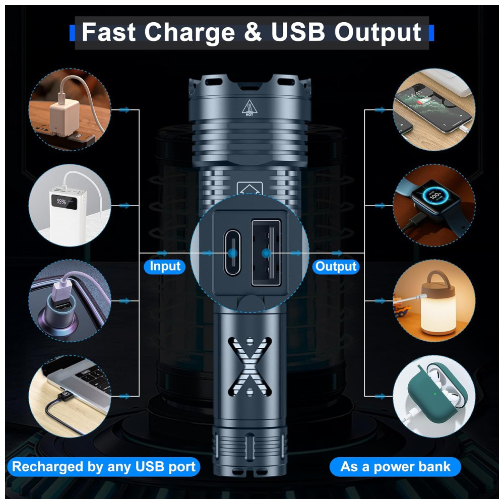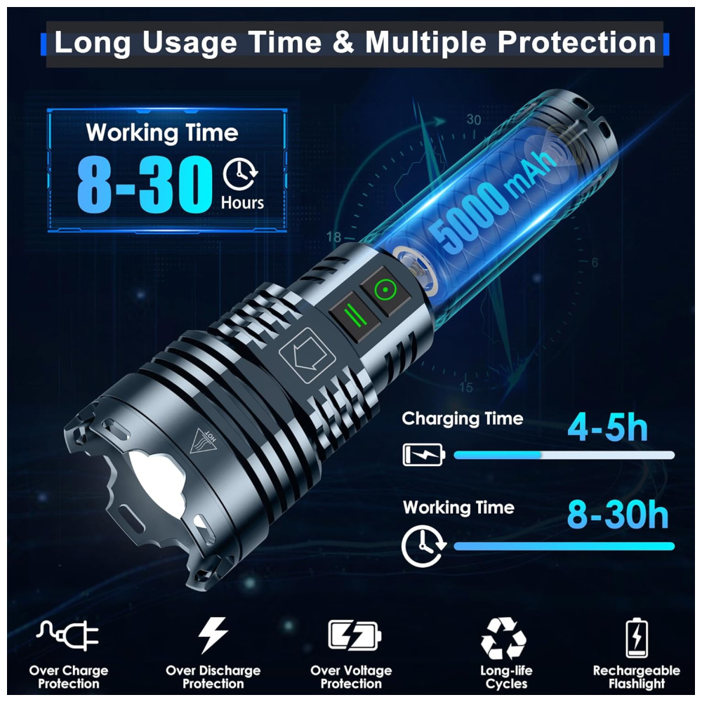 Características Especiais: Lanterna Mais Brilhante 5200 Lumens, 24 Horas de Uso, À Prova D’Água IP67, 6 Modos de Luz Ajustáveis, Foco Ajustável, Alta Potência e Carga Rápida 4 Horas, Resistente a Impactos, Alcance de 8000 Pés, Funciona como Power Bank,