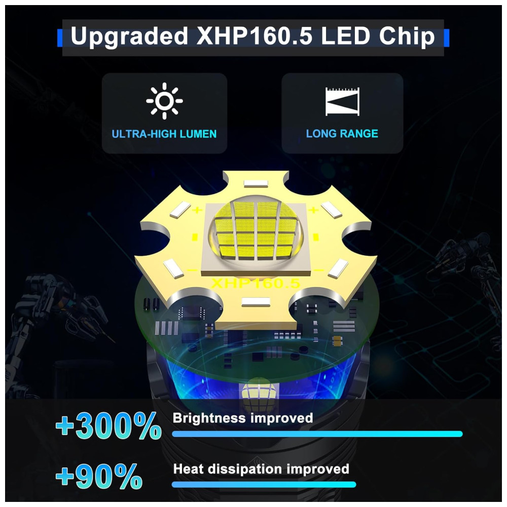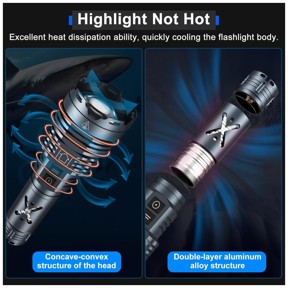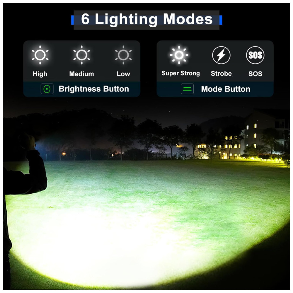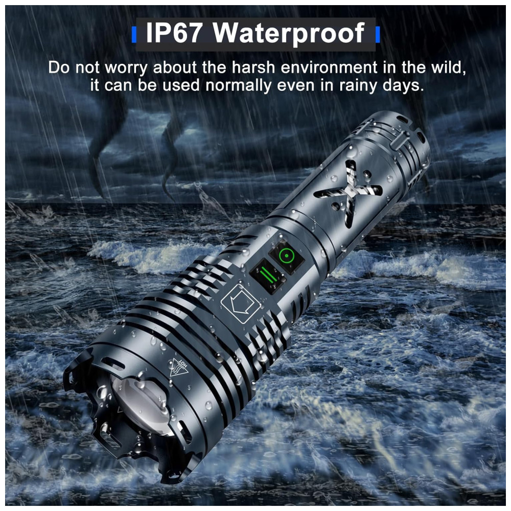 Características Especiais: Lanterna Mais Brilhante 5200 Lumens, 24 Horas de Uso, À Prova D’Água IP67, 6 Modos de Luz Ajustáveis, Foco Ajustável, Alta Potência e Carga Rápida 4 Horas, Resistente a Impactos, Alcance de 8000 Pés, Funciona como Power Bank,