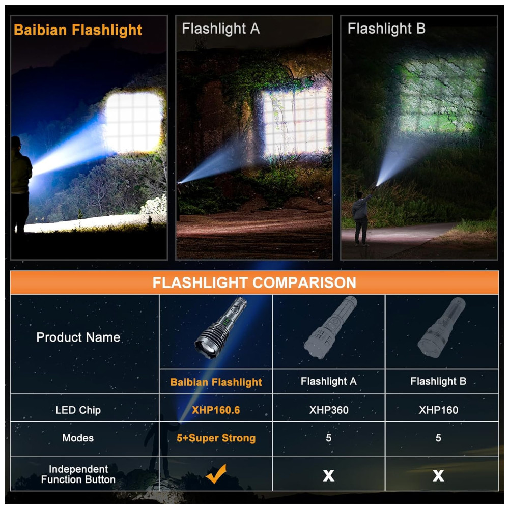 Lanterna Recarregável de Alta Potência 5500 Lumens Baibian Super Brilhante Tática e Resistente à Água com Zoom e 6 Modos de Iluminação