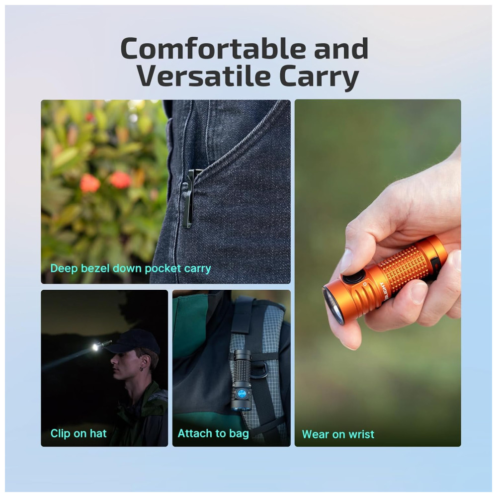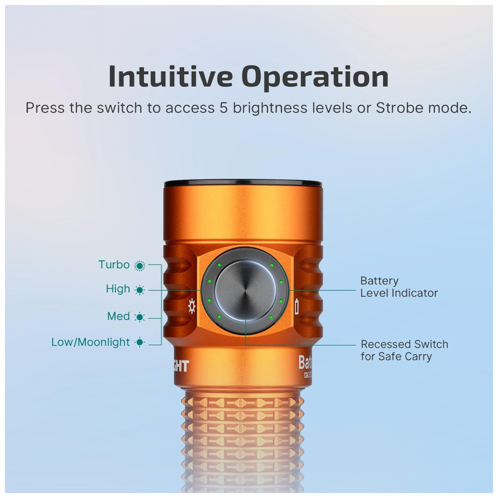 Com a Lanterna OLIGHT BatonTurbo EDC, você terá em mãos um equipamento fácil de transportar e versátil. Seu design compacto permite carregá-la no bolso com a customizada presilha bidirecional. Com 1000 Lumens de potência, ela projeta um feixe de longo alcance de até 510 metros, sendo perfeita como luz de apoio para maior visibilidade. Além disso, a bateria recarregável garante autonomia de até 50 dias no modo Moonlight. Possui um interruptor de segurança embutido para transporte seguro e um painel intuitivo que exibe os níveis de brilho e energia. Leve, resistente e prática para uso diário ou situações de emergência.