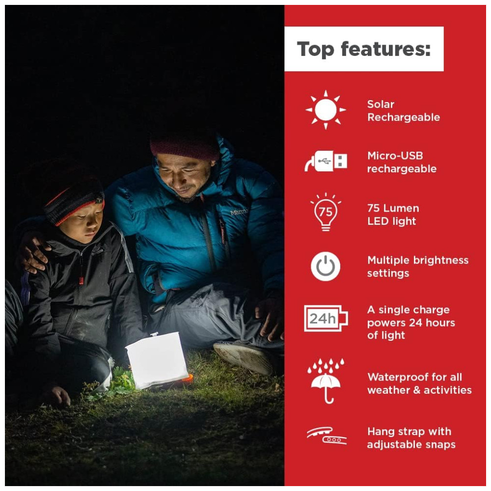 Lanterna brilhante movida a energia solar com 75 lumens de luz LED. Múltiplas configurações de brilho tornam na uma luz perfeita para ambientes internos ou externos.