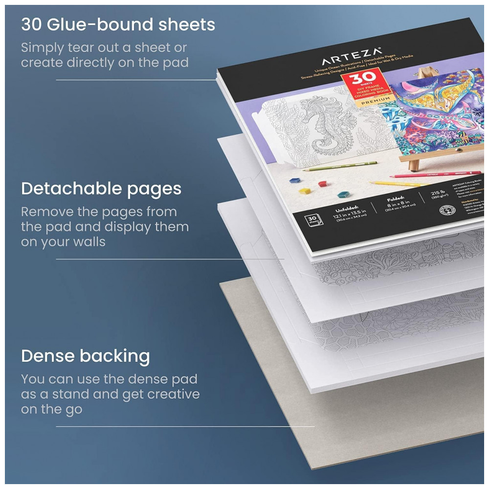 Com o conjunto de 72 Lápis de Cor Arteza e um livro de colorir com 30 padrões oceânicos, você pode relaxar colorindo nossos desenhos únicos de um lado. Cada imagem está em uma página perfurada, facilitando a remoção e exposição dos seus designs favoritos.