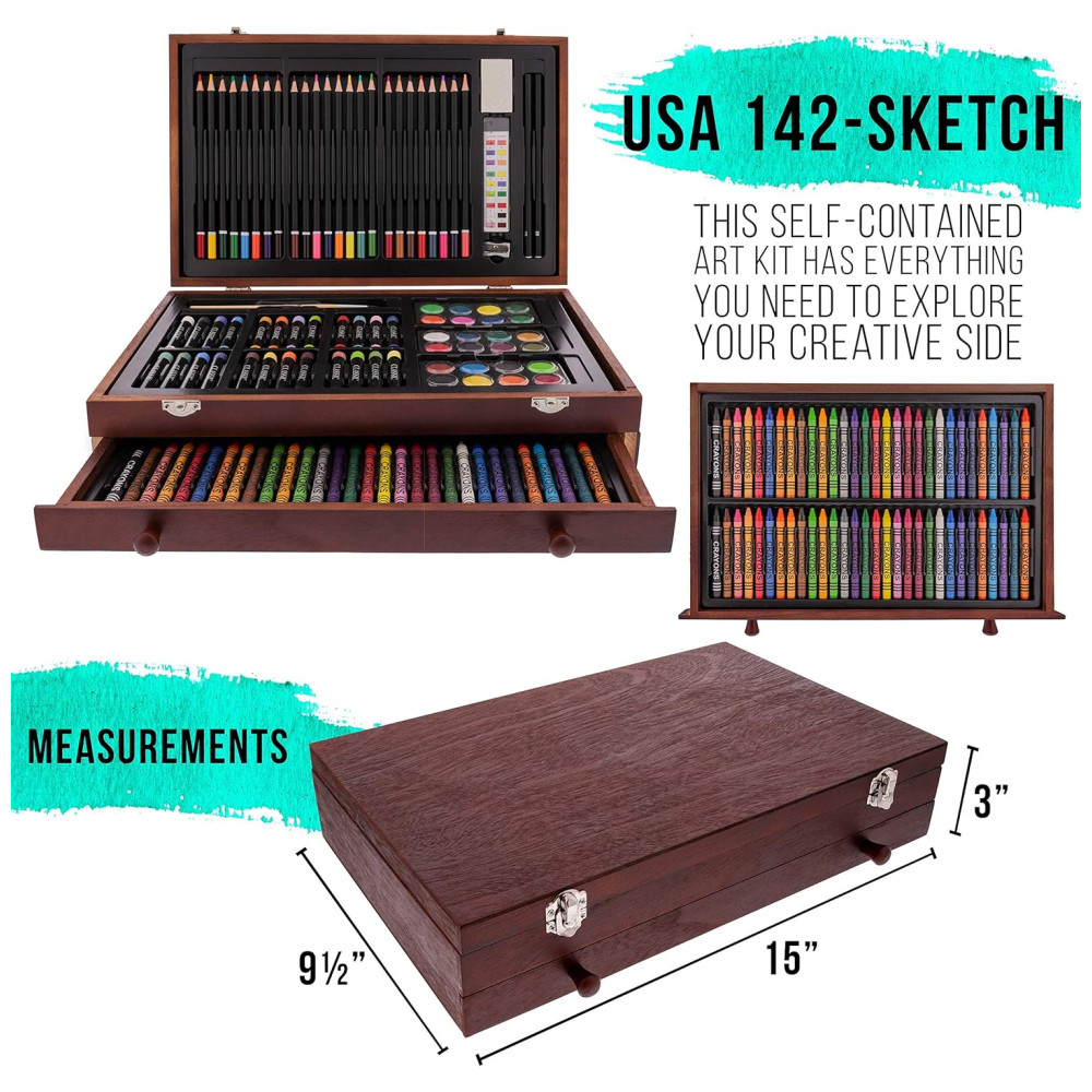 O conjunto de desenho de caixa de madeira de 142 peças inclui 24 lápis de cor, 24 pastéis de óleo, 24 bolos de aquarela, 60 lápis de cera, 3 bandejas de mistura, 2 lápis de desenho, 2 pincéis, apontador, régua e borracha