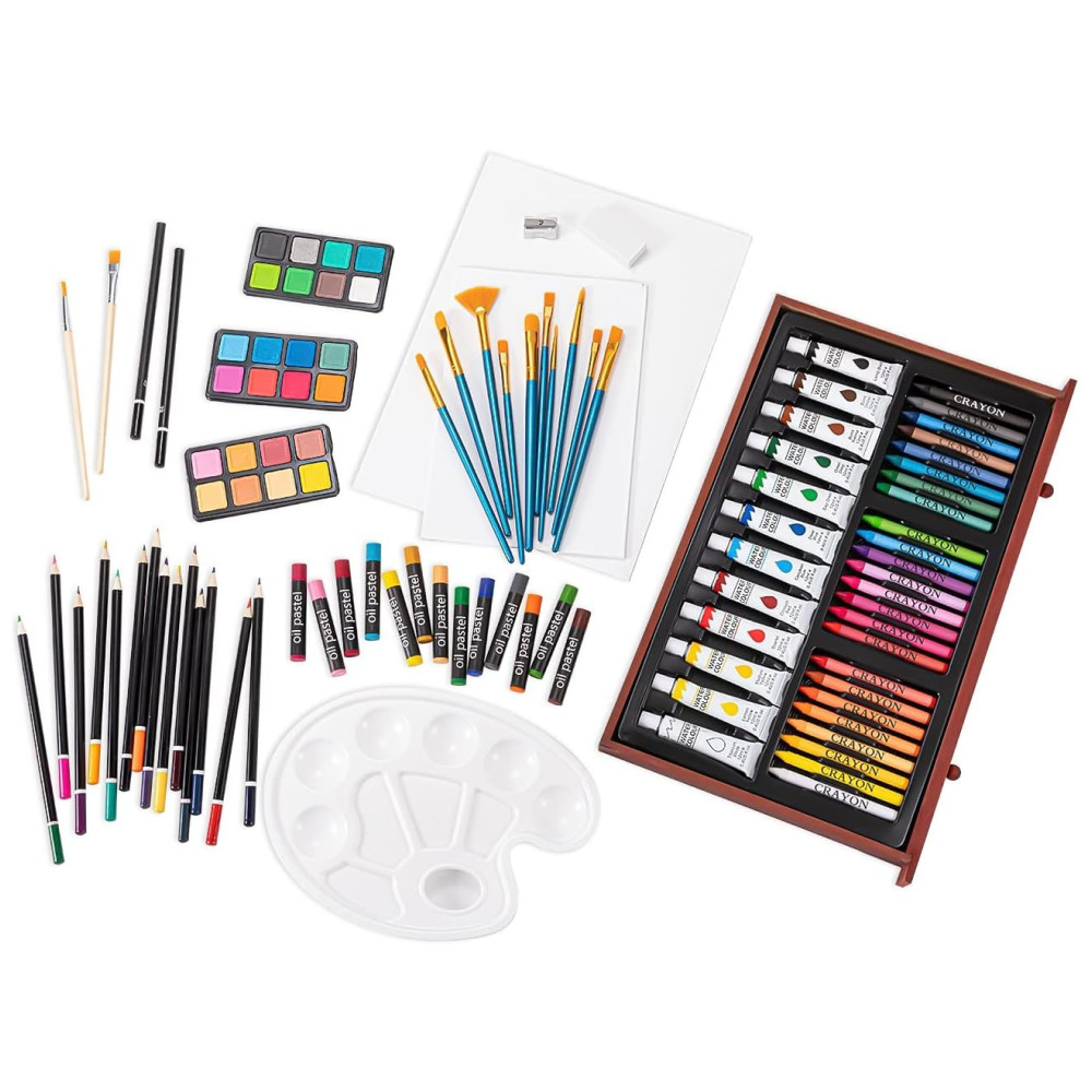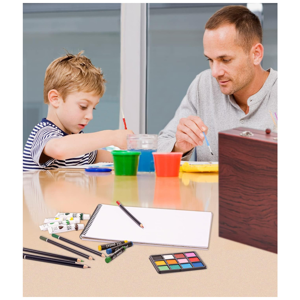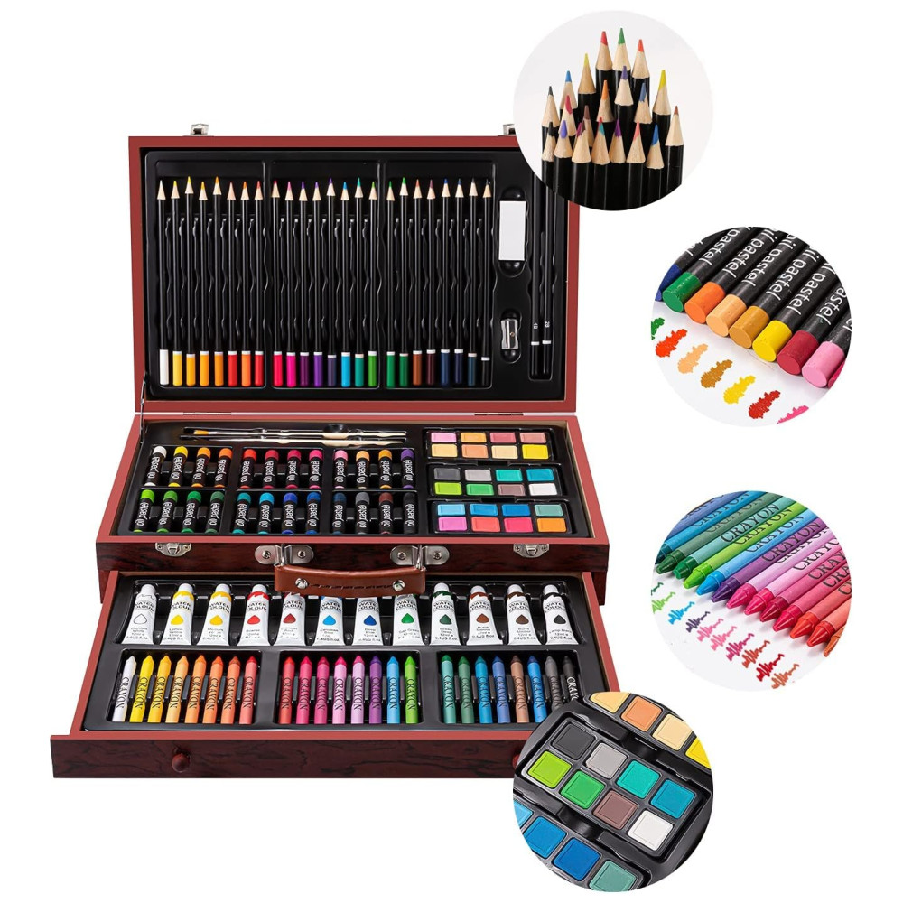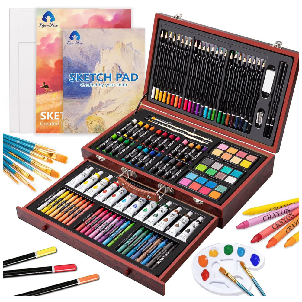 Vigorfun Luxury Art Supply 129 Piece Mega Wood Box Conjunto de arte, pintura e desenho com roda de mistura de cores e almofadas de papel para desenho