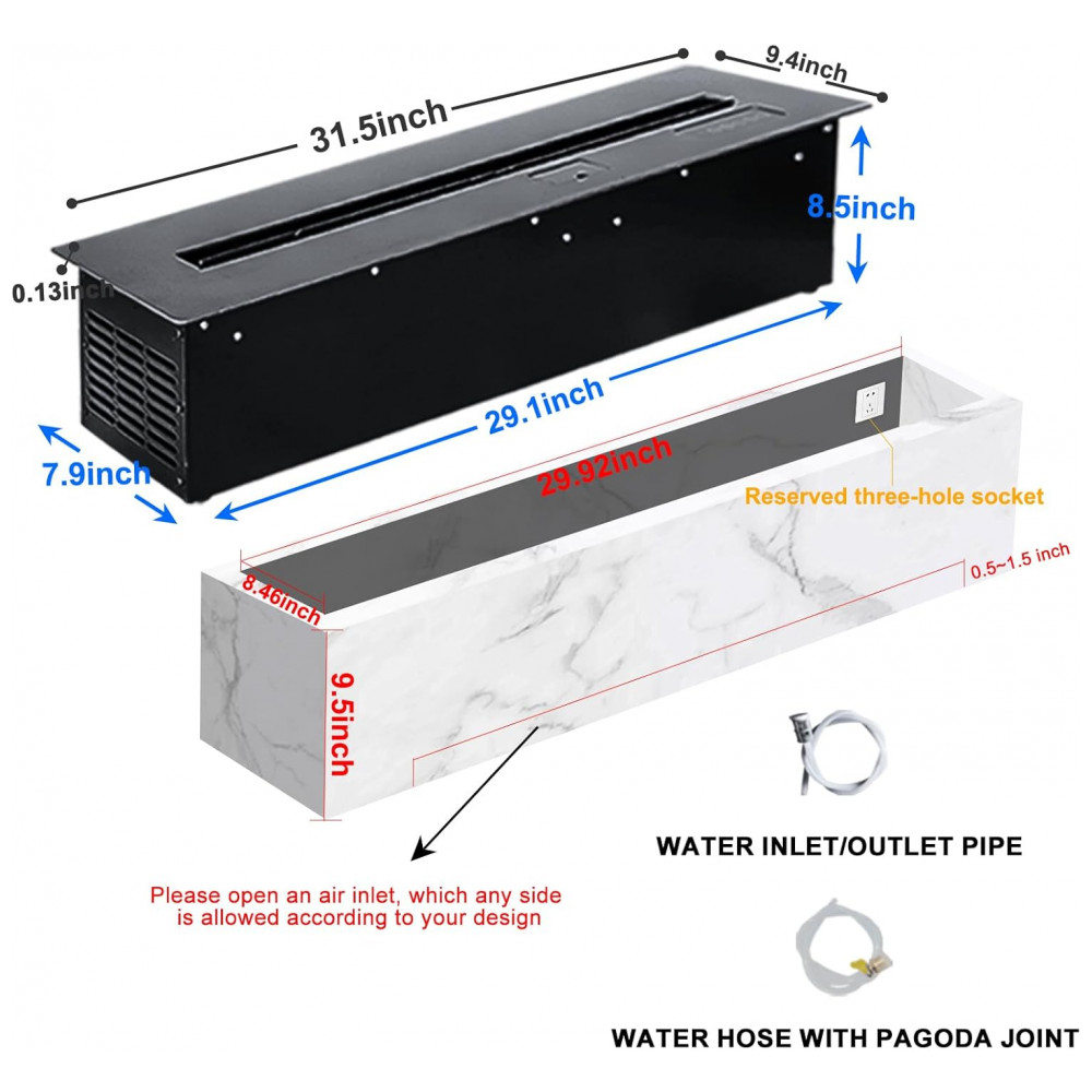 Lareira elétrica com tecnologia ultrassônica de atomização de água pura para gerar névoa iluminada por LEDs, criando chama tridimensional realista sem calor. Pode ser instalada como aparelho de bancada ou embutida, com conexão direta de água para operação contínua. Possui 8 cores de chama dinâmicas ajustáveis via aplicativo, controle remoto e painel touch flexível. Construída em aço inoxidável resistente com acabamento em pó, oferece consumo de energia de 264 W, funcionamento silencioso (menos de 45 dB) e timer para controle automático. Ideal para ambientes internos como casas, escritórios, hotéis, promovendo decoração sofisticada com simplicidade operacional.