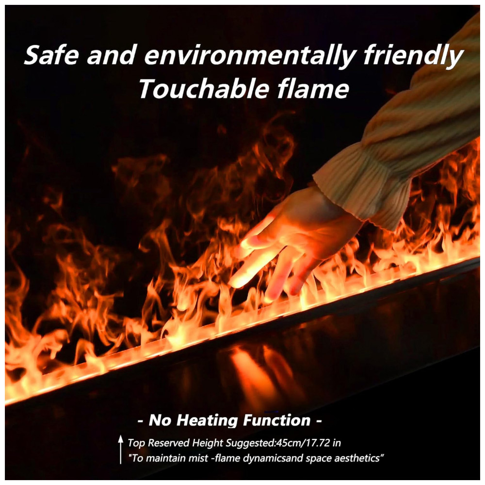 Lareira elétrica a vapor de água com efeito de chama atomizada 3D realista, gerado por sistema de nebulização ultrassônica integrada que produz vapor iluminado por LEDs para simulação visual precisa sem produção de fumaça ou calor. Inclui controle manual do nível de água para manutenção consistente da névoa e desempenho otimizado da chama simulada, além de controle remoto para ajuste da intensidade da chama e do efeito de nebulização com função dimmer. Projetada para instalação embutida em ambientes internos, opera em voltagem 110V-120V / 60 Hz com cabo de alimentação de 1,52 metros (5 pés) e padrão de tomada americano. Estrutura em metal com acabamento em pintura eletrostática, sem necessidade de ventilação externa. Indicada para salas de estar e centros de entretenimento com design moderno e operação decorativa.