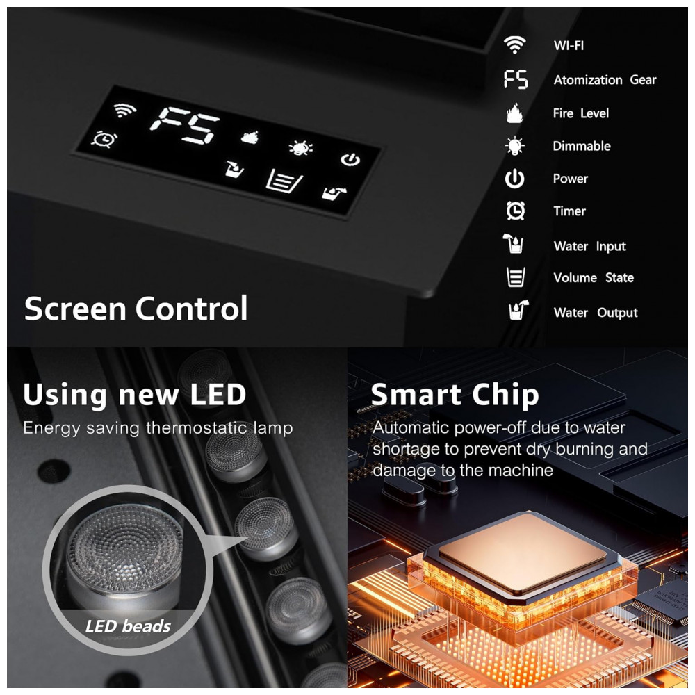 Lareira elétrica a vapor de água com efeito de chama atomizada 3D realista, gerado por sistema integrado de nebulização ultrassônica que produz vapor iluminado por LEDs para simulação visual precisa sem fumaça ou calor. Dispõe de controle manual do nível de água para garantir nebulização consistente e desempenho otimizado da chama, complementado por controle remoto para ajuste da intensidade da chama e do efeito de névoa. Projetada para instalação embutida em ambientes internos, opera em voltagem 110V-120V / 60 Hz com cabo de alimentação de 1,52 metros (5 pés) e padrão de tomada americano. Estrutura metálica com acabamento em pintura eletrostática, sem necessidade de ventilação externa e com função dimmer ajustável. Indicada para salas de estar e centros de entretenimento com foco em design moderno e operação decorativa.