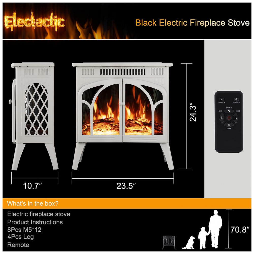 Design e Dimensão Esta é a nossa lareira mais recente, que adota um conceito de design retrô. O tamanho do fogão é 59 X 27 X inclui pedestal, e o peso é de apenas 33,18LBS. O fogão é todo feito de ferro fundido bege e é muito bonito e forte. o que significa que o produto é muito portátil e um um adulto pode facilmente levantar o fogão.