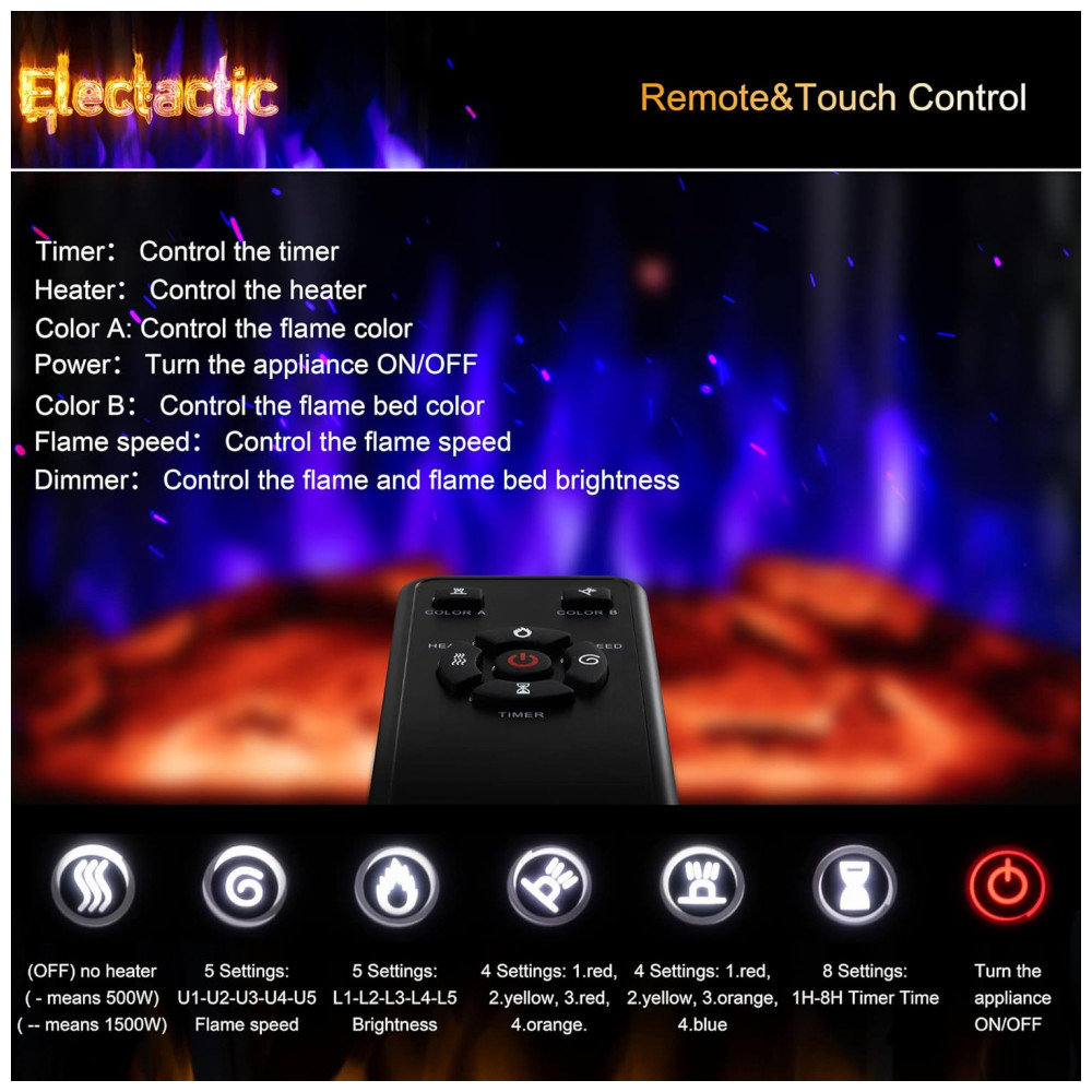 Fácil de usar Nosso produto tem controle remoto, então os compradores só precisam deitar na cama ou no sofá e mover os dedos para ajustar a lareira ao seu favorito. Além disso, nosso design de controle remoto é muito simples e todas as funções do produto podem ser ajustadas através do controle remoto. Mesmo os idosos podem aprender facilmente a usar o controle remoto. Ao mesmo tempo, o fogão vem com um painel de luz de toque que pode ser controlado manualmente, muito conveniente.