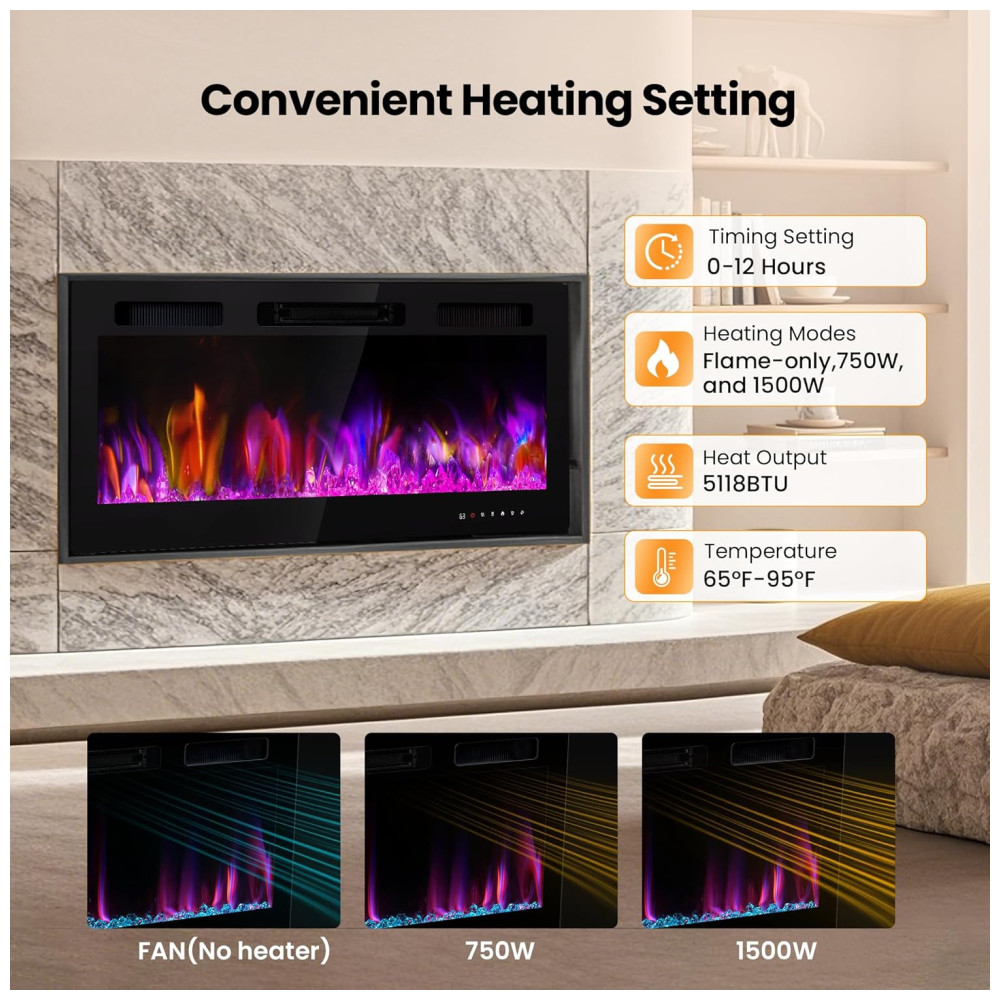 Lareira Elétrica de 107 cm Realsmart 750W/1500W Embutida ou de Parede Controle Remoto Timer 12 Cores de Chama e Brilho Ajustáveis Tela Touch