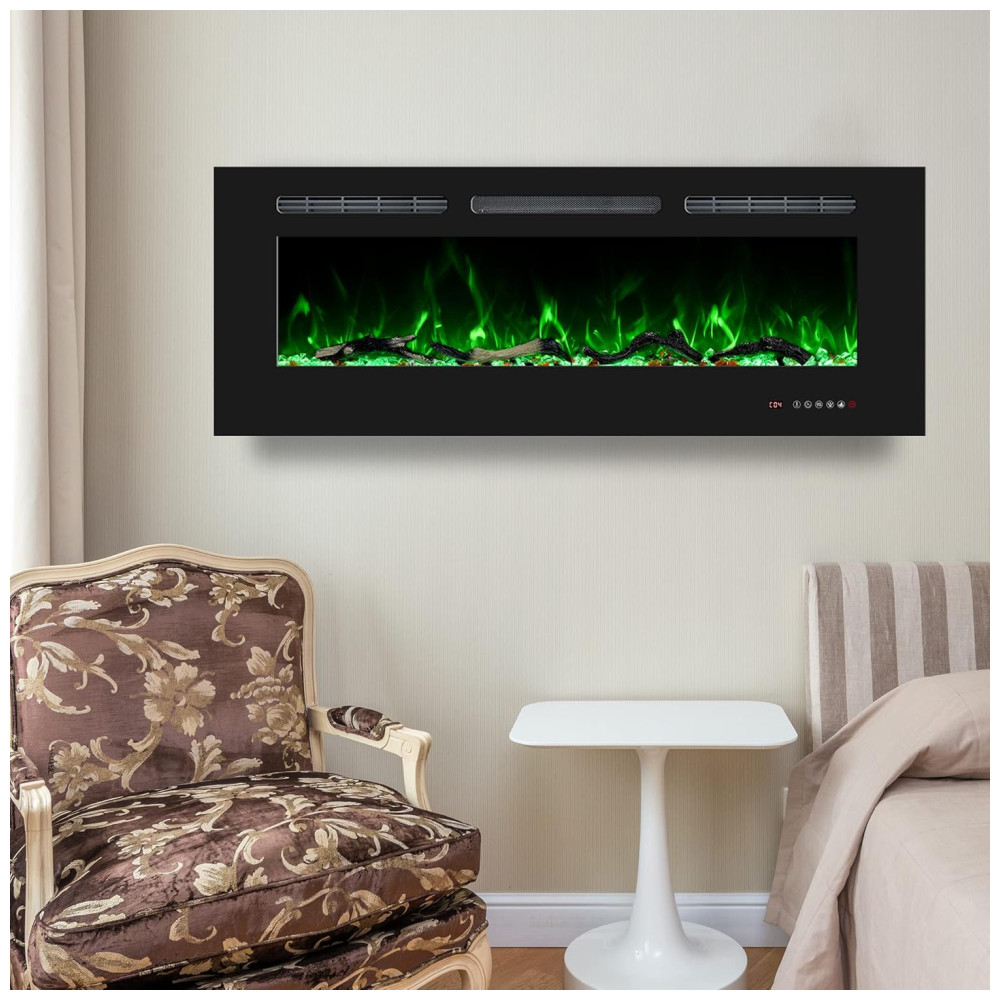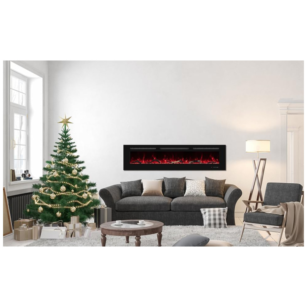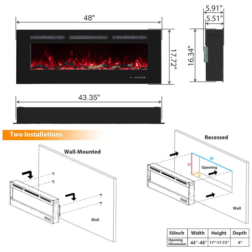 Esta lareira elétrica oferece dois métodos de instalação rebaixado na parede ou montado na parede, permitindo que você decore sua casa com estilo diversificado. É fácil de ser instalada no tamanho adequado. A lareira inclui controle remoto e é decorativa, com uma moldura fina preta, maior área de exibição, painel de vidro temperado e material de ferro à prova de ferrugem, que compõe um corpo sólido com estilo moderno.